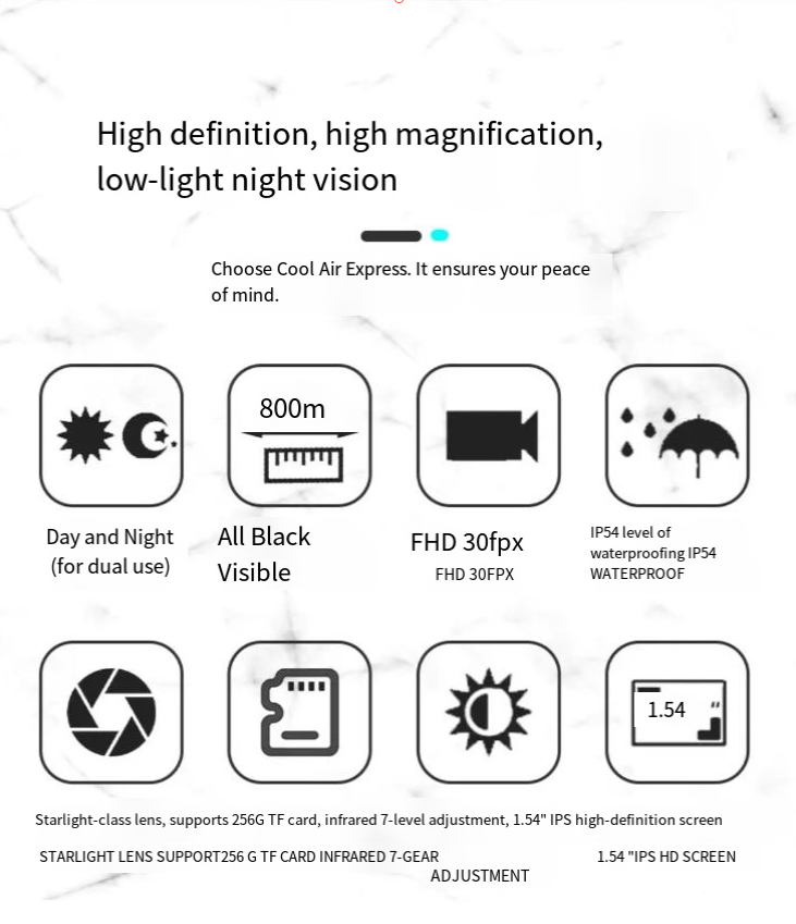 Possui uma capacidade de visão noturna de 800 metros, que pode capturar claramente cenas distantes em ambientes com pouca luz ou mesmo completamente escuros. Equipado com zoom digital de 10x, ele pode ampliar os detalhes do alvo, não deixando nenhum movimento à distância sem ser detectado. Ele também suporta gravação de fotos e vídeos em HD, que pode gravar com precisão imagens de visão noturna para revisão e análise subsequentes.