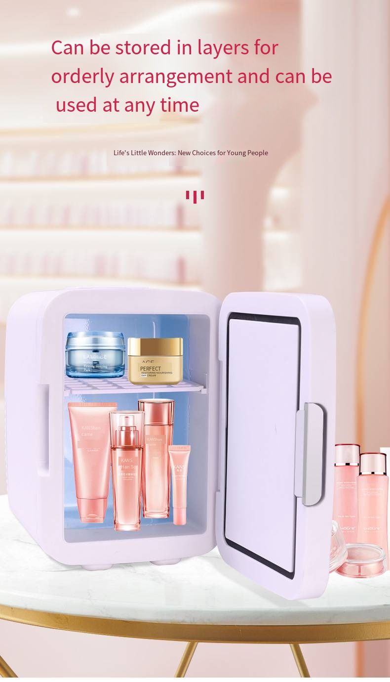 Apesar de seu pequeno tamanho, tem uma capacidade surpreendentemente grande. O interior é bem organizado, permitindo que você armazene facilmente várias latas de bebidas, como Coca-Cola, RIO e Pepsi, atendendo à sua necessidade de uma bebida gelada a qualquer momento. Ainda mais atenciosa é sua capacidade de armazenar cosméticos, mantendo seus produtos para a pele e maquiagem longe do calor e evitando que se deteriorem, mantendo sempre suas melhores condições.