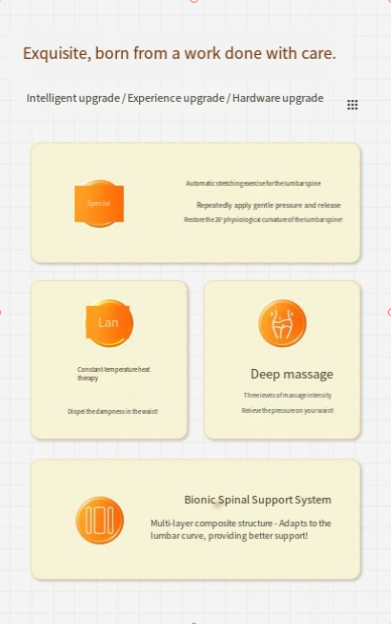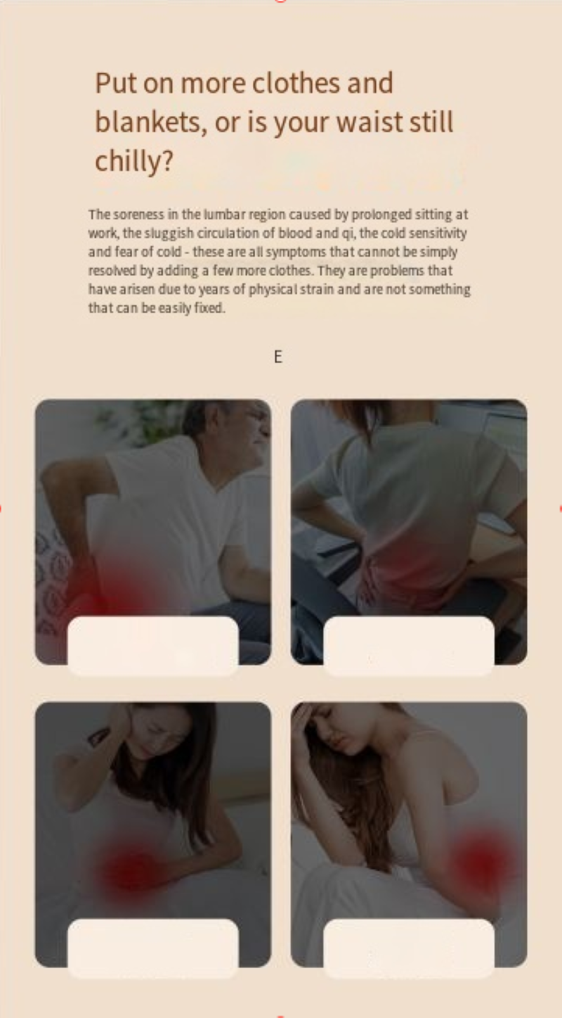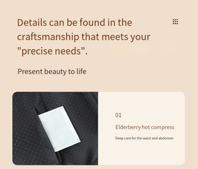 Compressa quente penetrante de 40-60 °C: A corrente quente penetra diretamente na cintura e no abdômen, afrouxando o frio e a rigidez da sessão prolongada na raiz. Pessoas com problemas de disco lombar antigos e dores nas costas pós-parto "sentirão sua cintura mais flexível quanto mais a usarem".