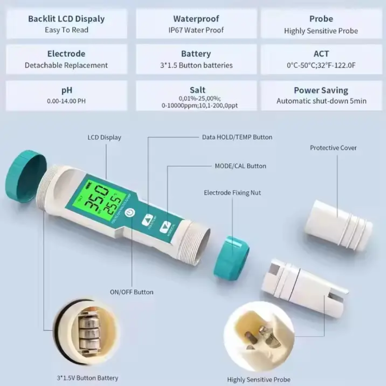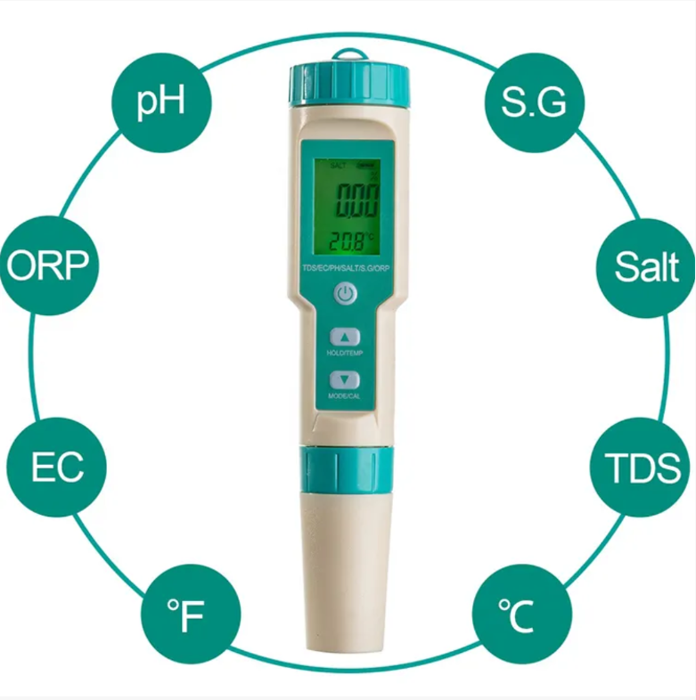Você ainda está preocupado com a qualidade desconhecida da água afetando sua saúde, agricultura ou plantio? Este detector de qualidade da água 7 em 1 combina 7 indicadores principais, como pH, ORP, EC, TDS, salinidade (SG) e temperatura (°C / °F) em um. É um "mestre" completo da qualidade da água para cenários como uso doméstico de água, aquicultura, jardinagem e uso industrial de água, permitindo que você controle com precisão a qualidade da água e se sinta à vontade sem preocupações.