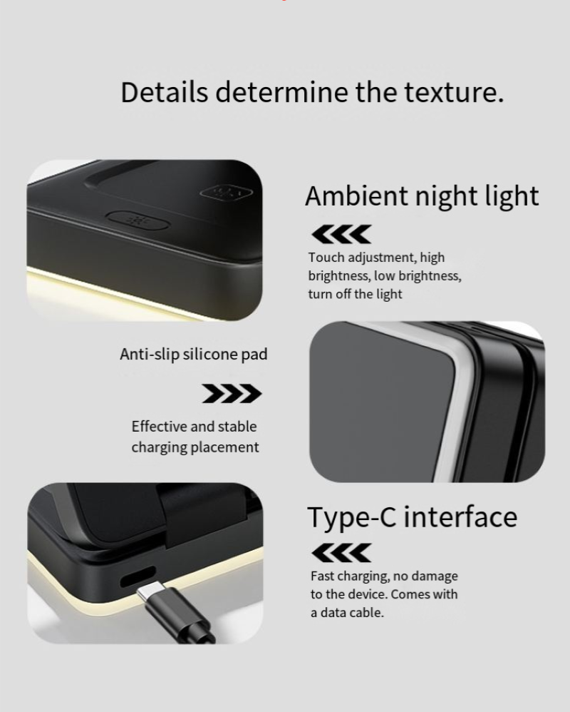 Sua tecnologia de carregamento magnético rápido alcança uma adesão precisa, carregando assim que se aproxima sem desvio. Quer você segure seu telefone verticalmente para assistir TV ou horizontalmente para jogar, o acessório magnético pode fixar firmemente o dispositivo, permitindo que você carregue e jogue sem quaisquer restrições. Ao mesmo tempo, é compatível com vários tipos de fones de ouvido e relógios para carregamento. Com uma base, você pode lidar com vários dispositivos, dizendo adeus completamente à bagunça da mesa causada por cabos emaranhados.