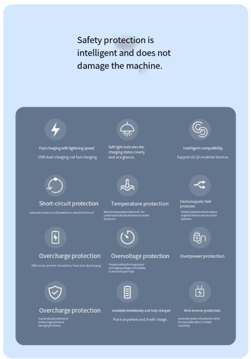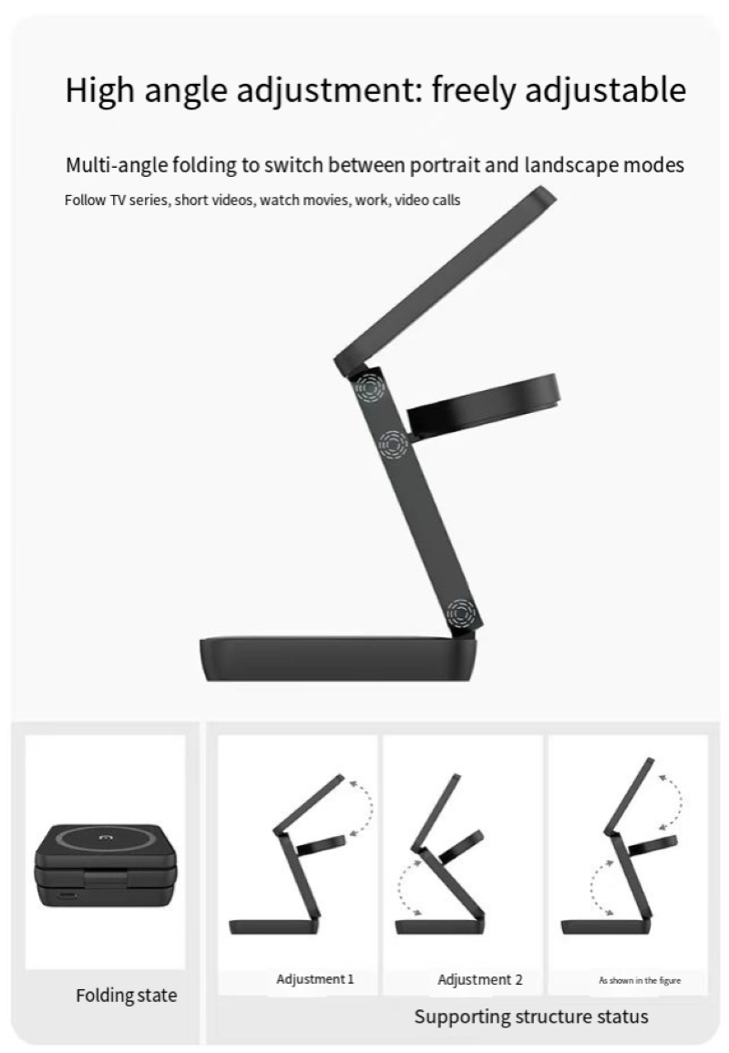 A função de ajuste de vários ângulos é adequada para todos os cenários: você pode ajustar o ângulo de visão ao segurar o telefone verticalmente, combinar a visão do jogo ao segurá-lo horizontalmente e dobrá-lo para carregar fones de ouvido e relógios discretamente. A tecnologia de carregamento de segurança garante que o processo não aqueça ou danifique a bateria, combinando carregamento rápido com segurança.