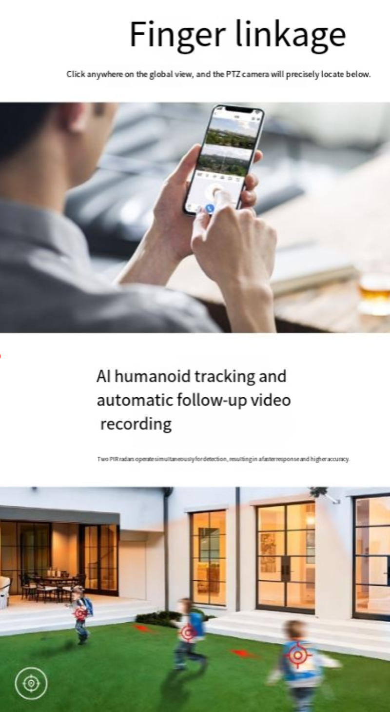Ele suporta ligação de três lentes para captura de bola, combinada com alarme sonoro e luminoso, detecção de corpo humano e rastreamento automático, etc. Quando atividades humanas anormais são detectadas, ele aciona automaticamente o rastreamento e emite alarmes sonoros e luminosos, alertando prontamente o usuário, tornando a segurança mais eficiente e inteligente.