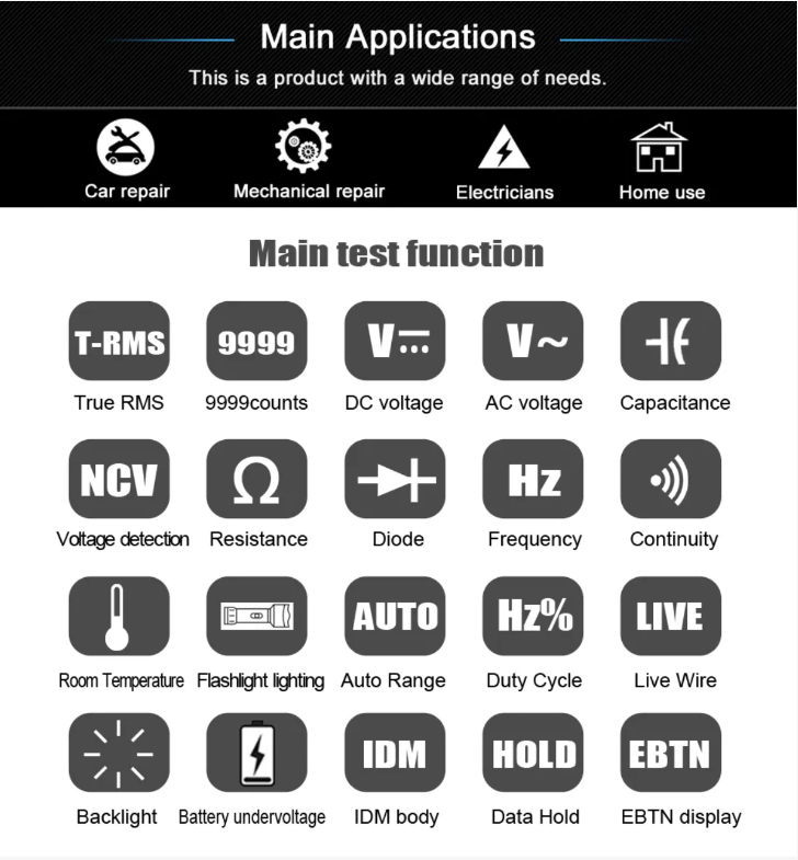 Em termos de desempenho, adota a tecnologia de medição True RMS para garantir a precisão da medição em formas de onda complexas; Possui múltiplas proteções (como fusíveis cerâmicos à prova de explosão, proteção de polaridade) para garantir a segurança operacional; Seu design portátil com uma capa de silicone antiderrapante pode ser facilmente colocado em uma bolsa de ferramentas e funcionar de forma estável em ambientes hostis.