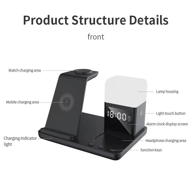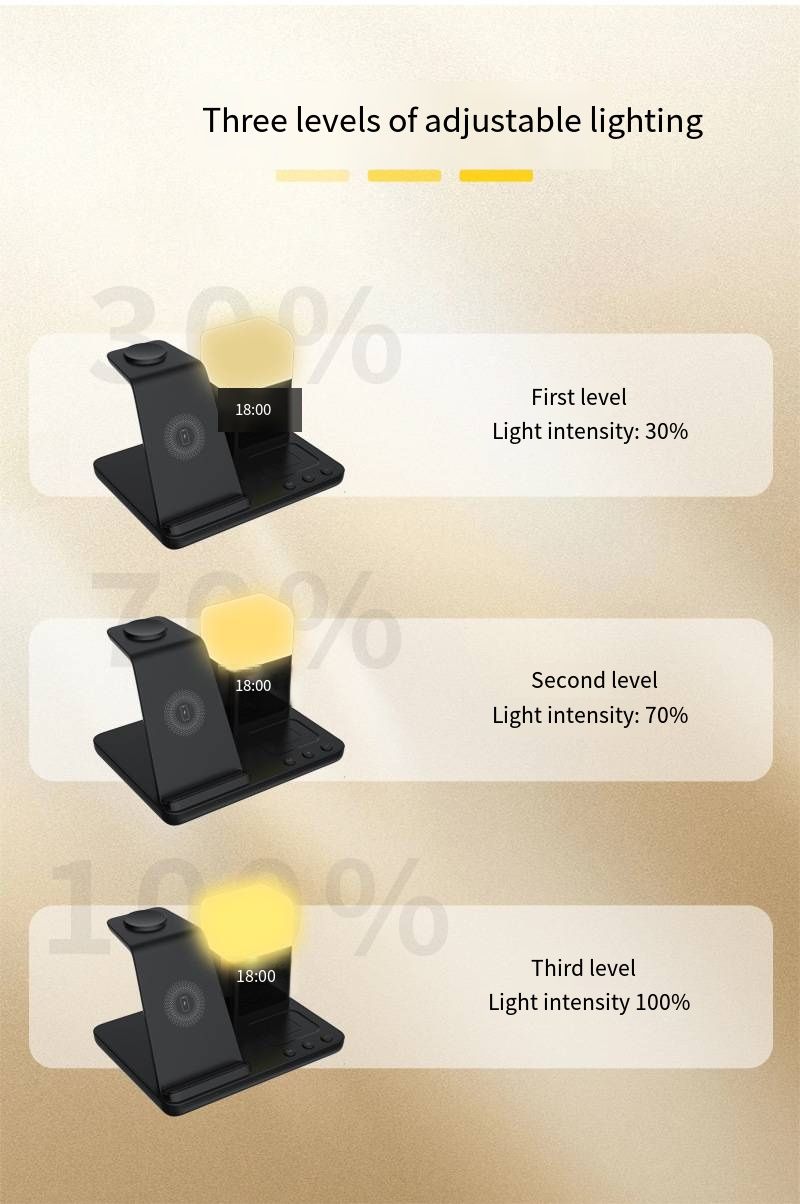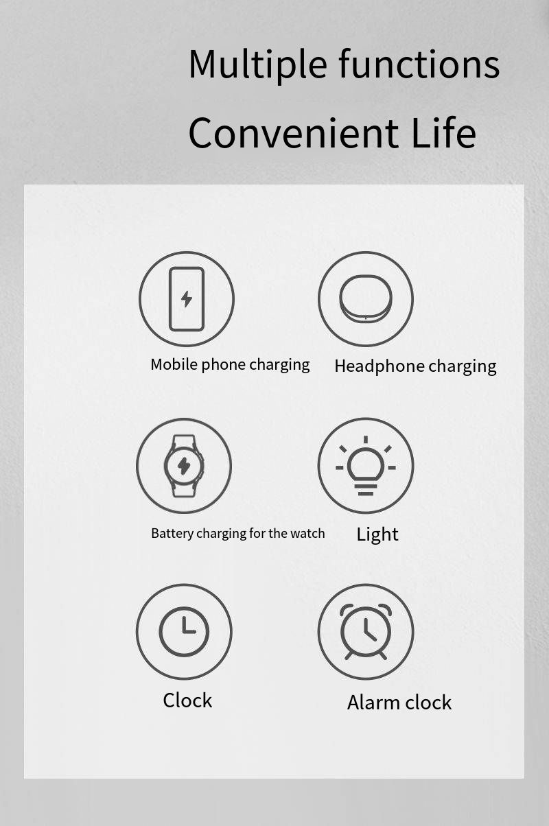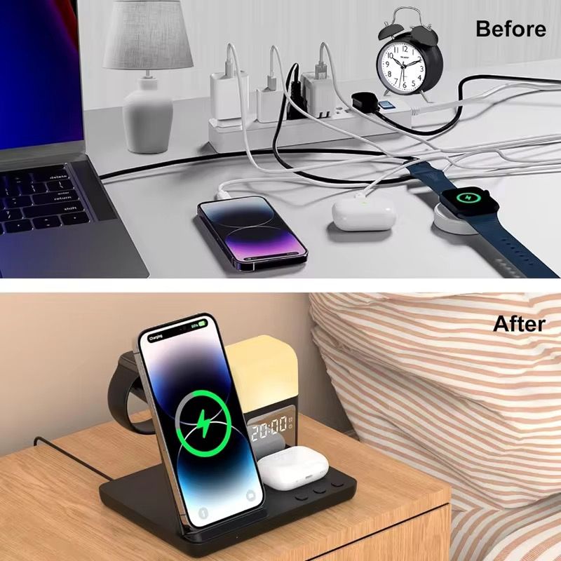 Sua função "6 em 1" é uma "solução definitiva" para carregamento de desktop: ele pode carregar iPhone, AirPods e iWatch sem fio e também integra funções de despertador, luz noturna e relógio. De manhã, seu telefone, fones de ouvido e relógio são despertados durante o carregamento e o alarme toca na hora certa; À noite, a luz noturna suave ilumina sua área de trabalho e o relógio mostra claramente a hora, permitindo que você gerencie o tempo e a iluminação durante o carregamento, obtendo vários benefícios.
