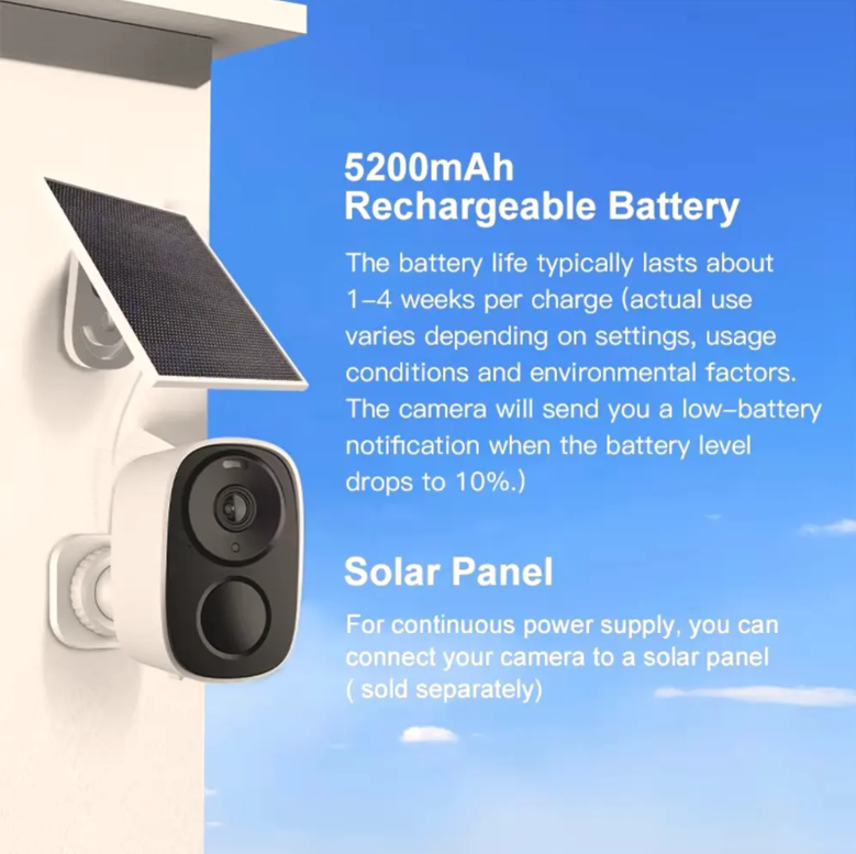 Ele quebra as limitações das câmeras tradicionais, que "dependem de fontes de energia e são vinculadas por fiação". É equipado com uma bateria recarregável de grande capacidade de 5200mAh e pode operar continuamente por 1-4 semanas após uma única carga (a duração real da bateria pode variar dependendo do cenário de uso); Ele pode ser emparelhado com um painel solar opcional, que carrega automaticamente durante os dias ensolarados, alcançando "zero contas de eletricidade ao longo do ano" e fornecendo fornecimento contínuo de energia. Seja no canto de um pátio, em uma cerca de fazenda ou em um armazém remoto, desde que haja luz solar, ele pode ficar de guarda 24 horas por dia, eliminando completamente a "ansiedade de eletricidade".