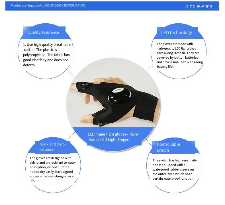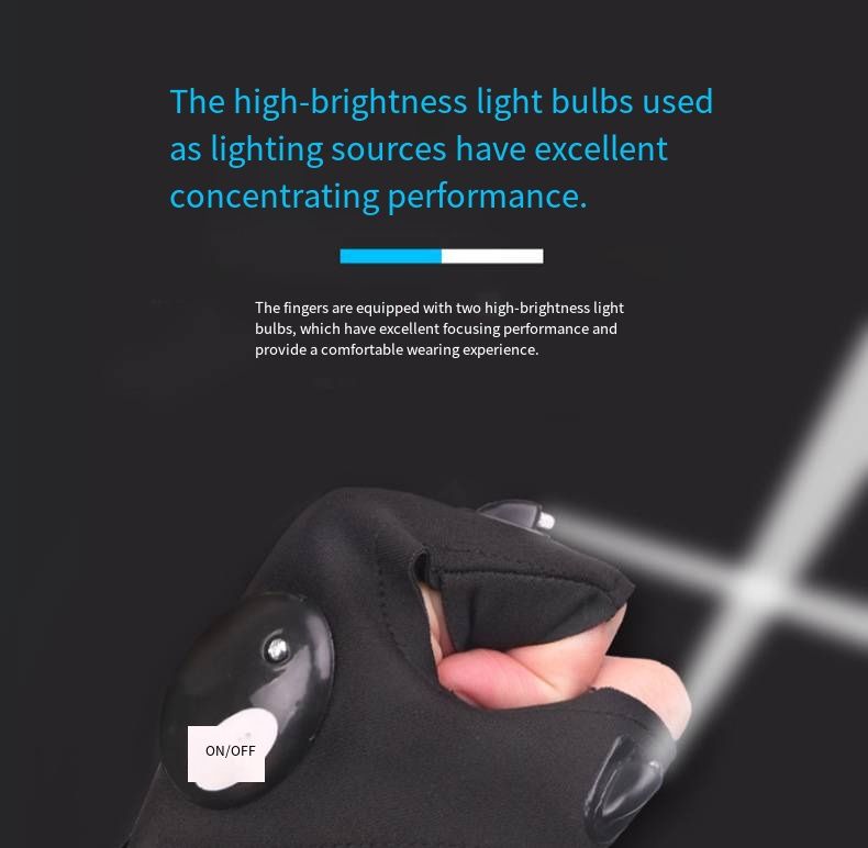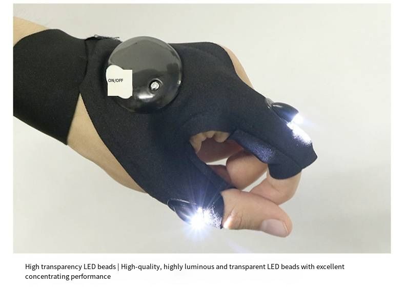 Possui um design engenhoso que combina a função de iluminação com a luva. O corpo principal da luva se ajusta perfeitamente à mão, proporcionando um ajuste confortável sem qualquer constrição. Nas áreas dos dedos, os dispositivos de iluminação são cuidadosamente colocados. Ao ligar o interruptor, uma luz brilhante é emitida pela ponta dos dedos, como se uma "lanterna móvel" tivesse sido instalada em ambas as mãos.