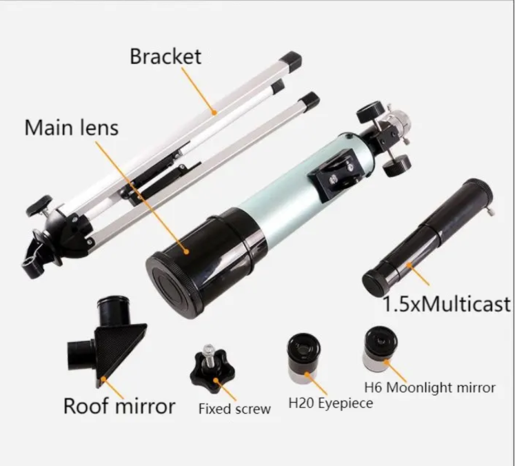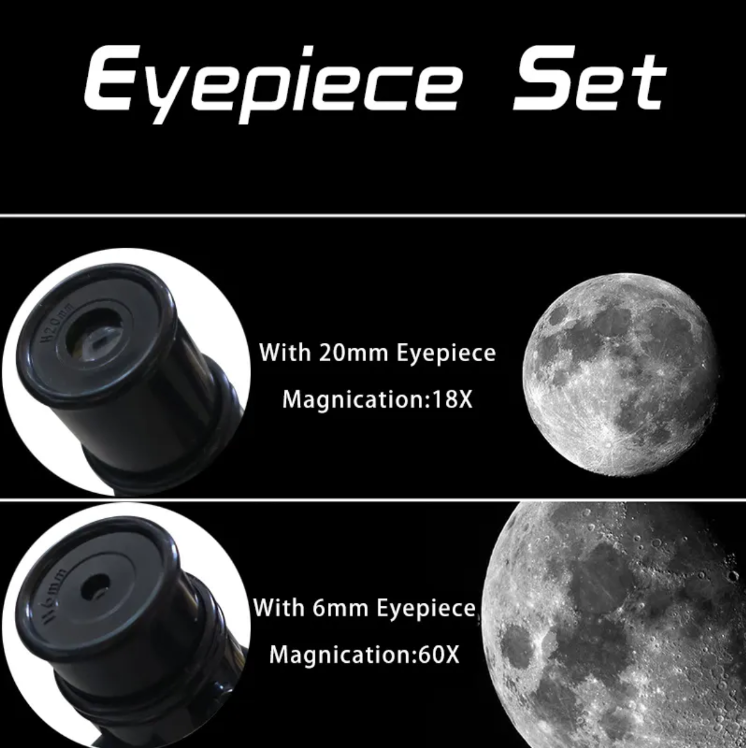 É equipado com dois tipos de oculares: H20mm e H6mm. Oculares diferentes podem trazer diferentes efeitos de observação. A ocular H20mm é adequada para observação inicial, permitindo capturar rapidamente o contorno geral dos corpos celestes e experimentar a vastidão do universo; a ocular H6mm pode alcançar maior ampliação, ajudando você a ver as características mais sutis dos corpos celestes, como as ravinas na superfície da lua e a estrutura requintada dos anéis de Saturno.