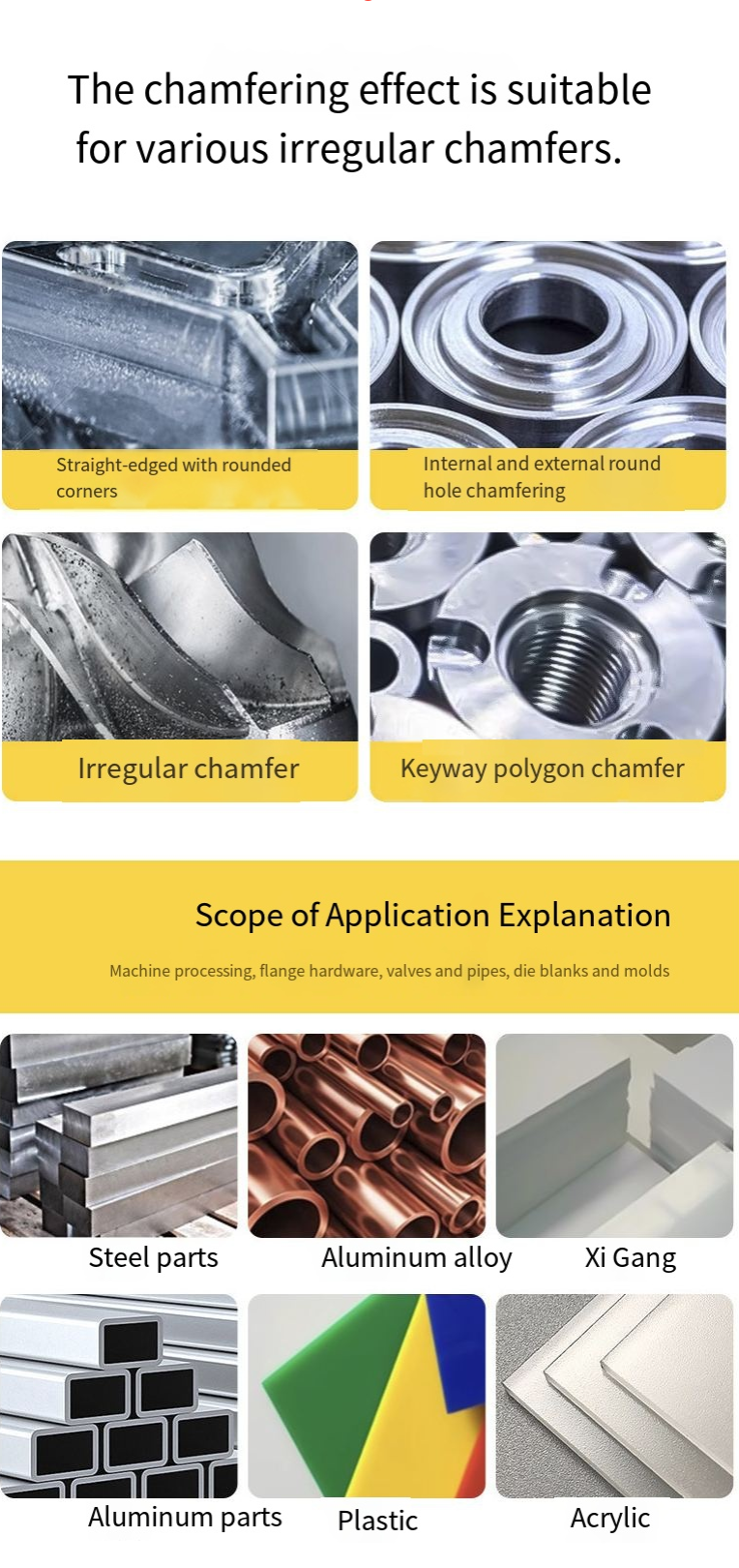 É adotada a cabeça de corte de aço de tungstênio de duas arestas, combinada com o design do rolamento auxiliar. A eficiência de corte é maximizada, o chanfrado é afiado e liso, e as barbantes são completamente eliminadas. Além disso, possui cinco funções de ajuste. O ângulo C pode ser livremente alternado de 0,1 mm para 1,5 mm, e o ângulo R pode ser livremente alterado a partir de R1,5. Pode atender às diferentes requirements for chamfer accuracy.