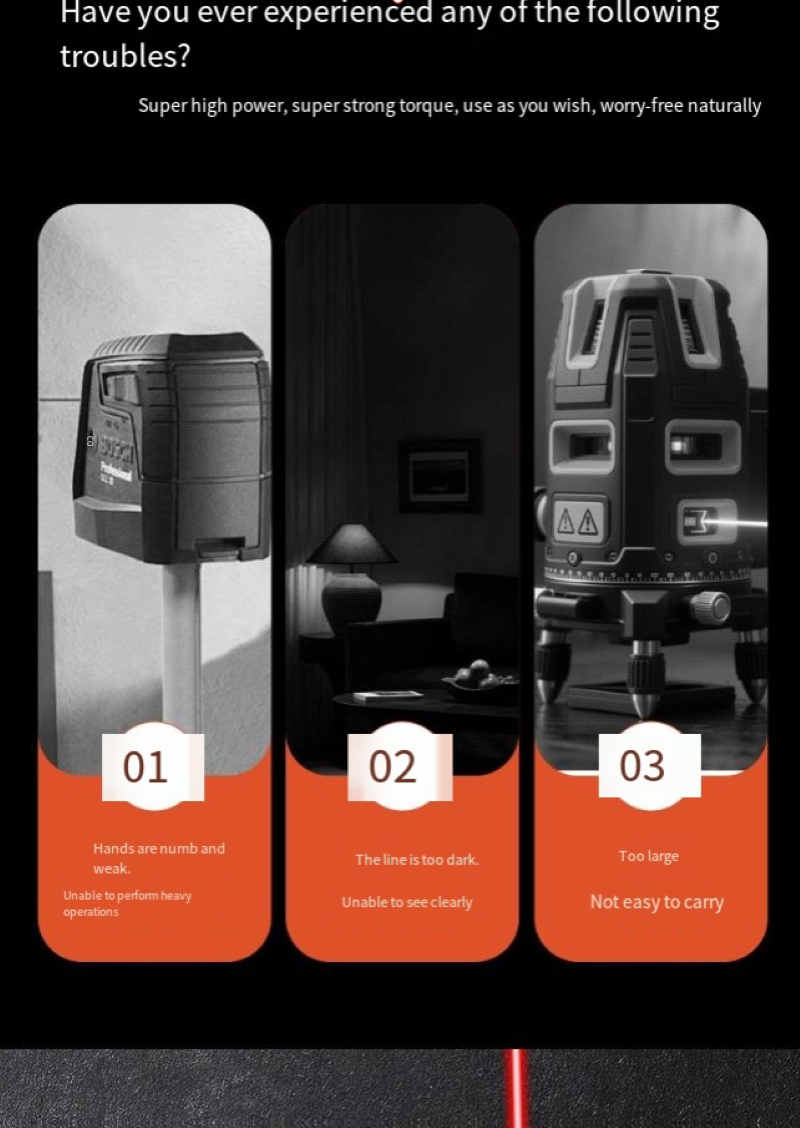Em cenários como decoração e construção, precisão e eficiência são o núcleo da entrega de qualidade. Este medidor de nível a laser, com suas quatro principais vantagens de "forte resistência à luz, visibilidade de área total; calibração inteligente, redução de erros a zero; comutação multimodo, aplicabilidade universal; portátil e fácil de usar, que pode ser aprendido em uma sessão", tornou-se o "assistente polivalente" para nivelamento de espaço.