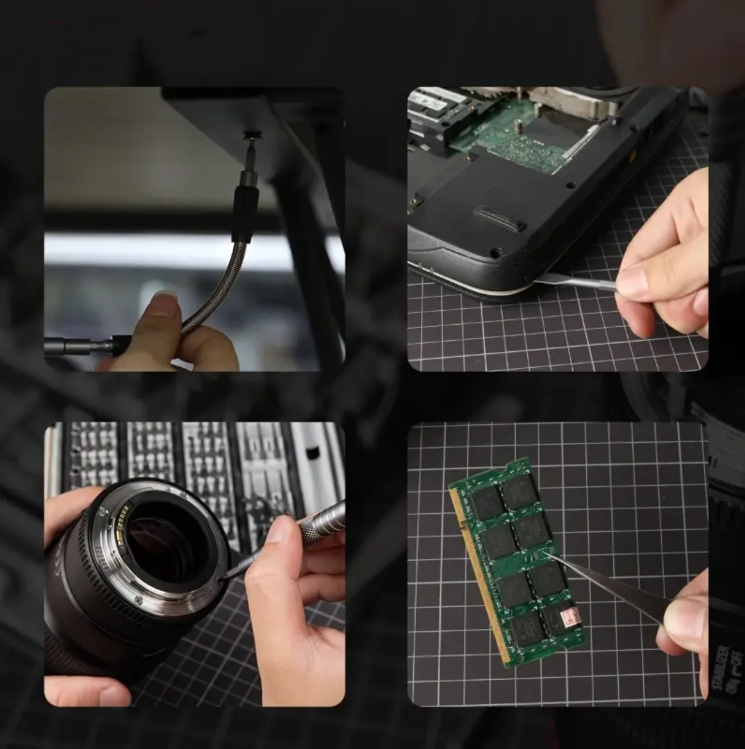Seu design é simples e prático. A caixa cilíndrica de armazenamento não só economiza espaço, como também pode ser facilmente colocada em gavetas ou caixas de ferramentas. Ao abrir a caixa de armazenamento, 128 bits de tamanhos diferentes estão organizados cuidadosamente, variando desde cabeças cruzadas e planas comuns até cabeças precisas de cinco pontas, em formato de Y e até especiais triangulares e hexagonais internas, cobrindo 99% dos cenários de reparo do dia a dia.