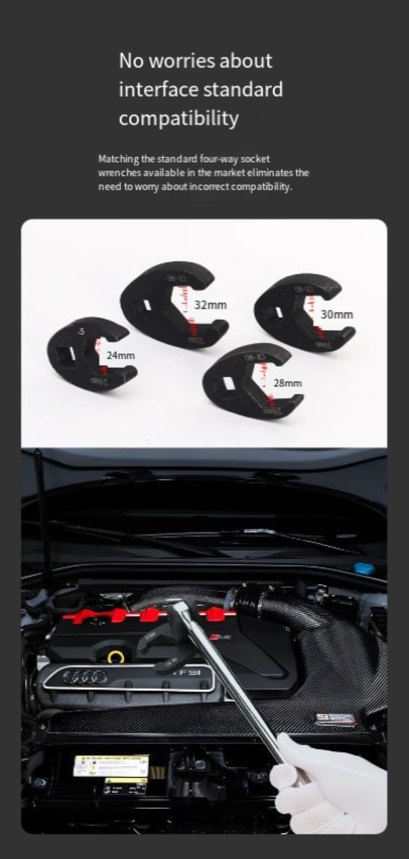 O material é plástico de engenharia de alta resistência + núcleo metálico, leve, durável e isolado. É seguro mesmo ao tocar fios durante o reparo do carro; A cauda da chave pode ser combinada com chaves de torque e bielas de extensão para uso, permitindo inseri-la facilmente no compartimento estreito do motor para operação sem remover peças.