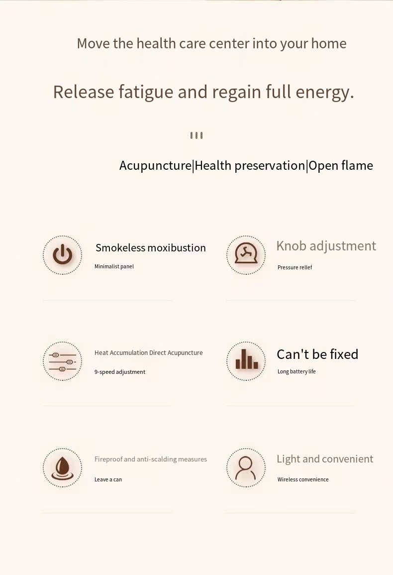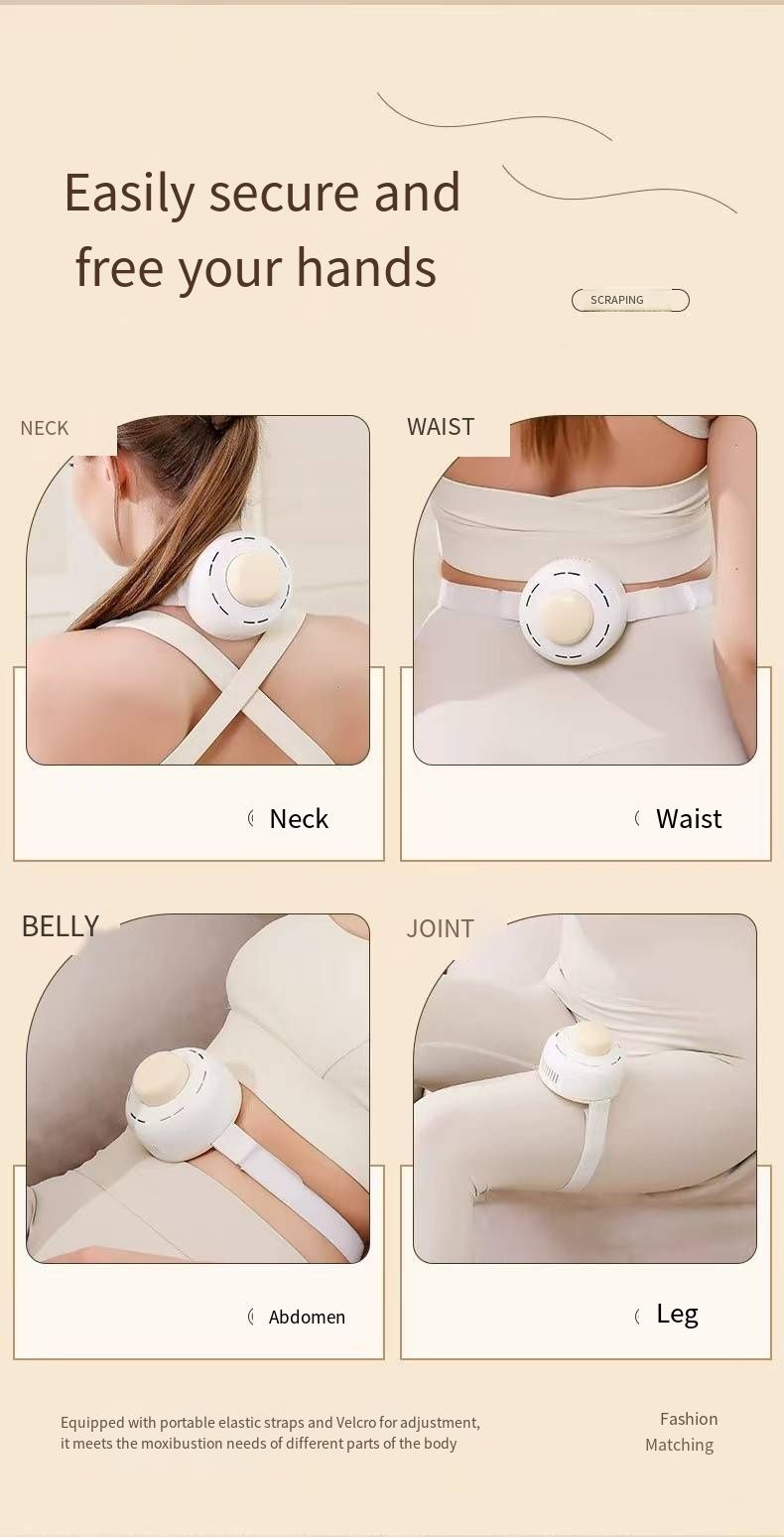 É o "pioneiro portátil" no campo da moxabustão. Ele adota um design de alça bem ajustado e pode se ajustar com precisão a várias áreas, como ombros, pescoço, costas e membros. Quer se trate de funcionários de escritório que aliviam a rigidez dos ombros e pescoço ou mães que precisam ajustar seus corpos, basta fixá-lo nos pontos de acupuntura e você pode iniciar os cuidados com a moxabustão. Ele libera suas mãos sem atrapalhar o trabalho ou as tarefas domésticas, alcançando verdadeiramente a "liberdade de moxabustão".