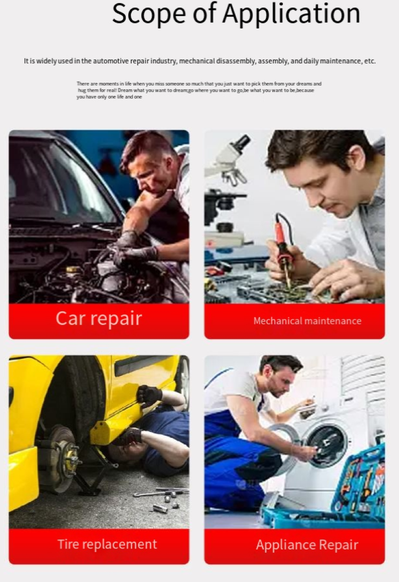 As ferramentas são forjadas em aço de cromo-vanádio de alta dureza, com revestimento cromado para prevenção de ferrugem e resistência ao desgaste. Eles não vão se deformar mesmo após uso prolongado. A caixa vermelha de armazenamento está claramente categorizada, tornando as ferramentas fáceis de ver à primeira vista, convenientes de levar e evitando perdas de roupa. Seja para as operações diárias dos profissionais de reparo automotivo, o autouso dos proprietários ou as adaptações de entusiastas de faça-você-mesmo, ele pode se tornar seu assistente confiável.