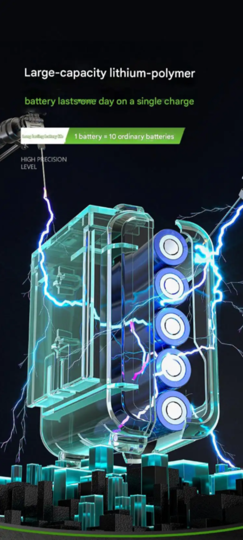 Usando laser verde com comprimento de onda de 523 nm, a luz é brilhante e clara. Em várias condições de iluminação em ambientes internos e externos, todas as 8 linhas de laser podem ser vistas claramente, com a distância máxima visível atingindo 25 metros. Seja para construção de paredes de curto alcance ou colocação de piso de longa distância, ele pode fornecer linhas de referência claras para trabalhadores da construção.
