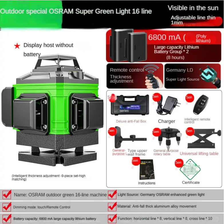 Como uma ferramenta de construção de nível profissional, pode projetar linhas de laser tridimensionais 3D, cobrindo toda a área de construção. Seja nivelando paredes e pisos, ou posicionamento vertical durante a instalação de portas, janelas e móveis, ele pode fornecer referências precisas, garantindo a precisão da construção e garantindo que cada detalhe da construção atenda aos requisitos. Além disso, seu design é robusto e durável, capaz de se adaptar a vários ambientes em canteiros de obras, com excelente resistência a choques e desempenho à prova de poeira, fornecendo suporte confiável para aplicações de construção de longo prazo e alta frequência. Com ele, a construção precisa não é mais difícil e ajuda a obter uma conclusão de alta qualidade dos projetos de construção.