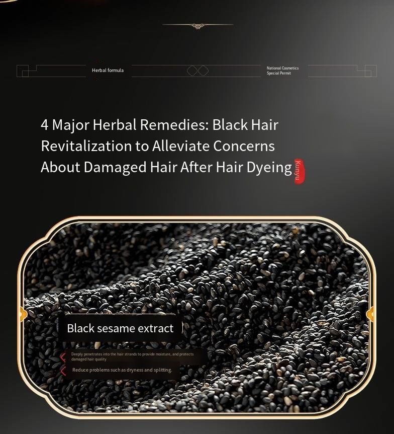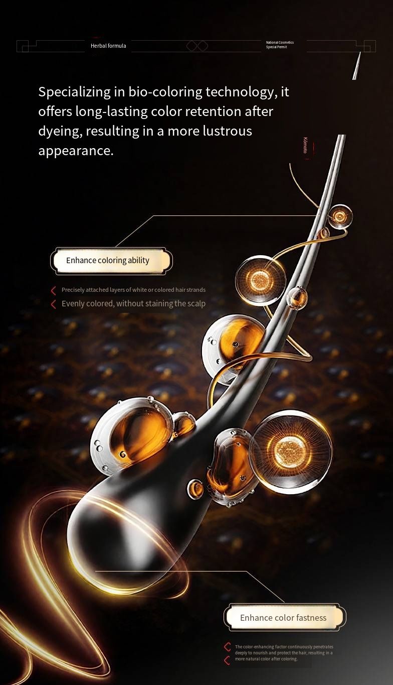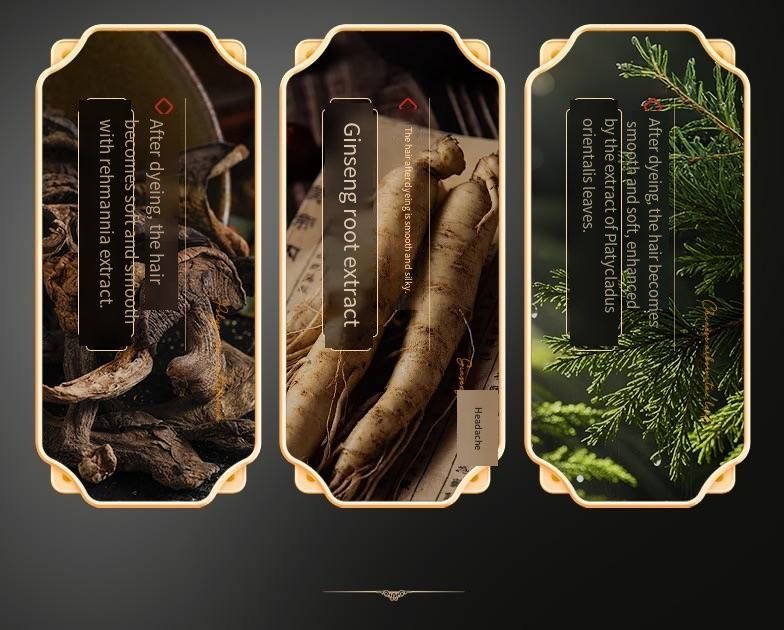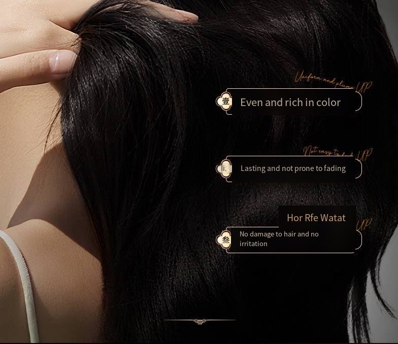 Extraindo essências vegetais como ginseng e gengibre, é livre de amônia e peróxido de hidrogênio, envolvendo suavemente os fios de cabelo: não apenas cobre com precisão o cabelo branco e o tinge em um "preto original" natural e rico, mas também pode nutrir o cabelo durante a tingimento, melhorando o ressecamento e o frizz, e deixando o cabelo liso e lustroso após a tintura.
