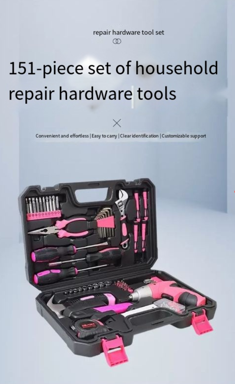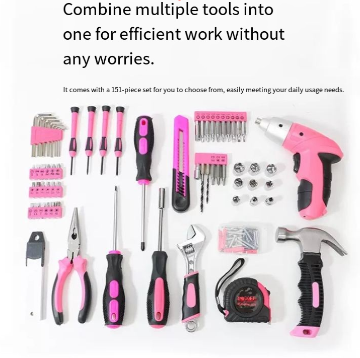 Kit de Ferramentas de Reparo Doméstico de Chave de Fenda Elétrica de 151 peças: Rosa "Equipe de Manutenção", fazendo a manutenção doméstica "parecer boa e ser poderosa"