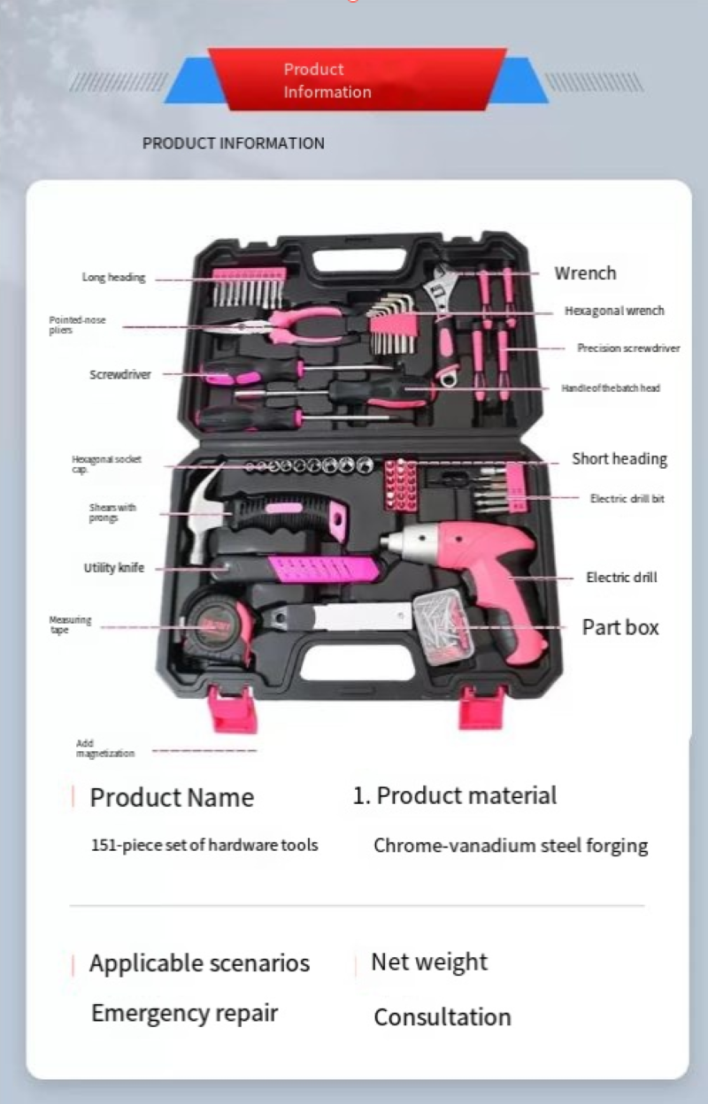 Ele vem com 151 configurações de ferramentas ricas, incluindo martelos, chaves de fenda, chaves, alicates, etc., cobrindo todos os cenários de reparos domésticos, como montagem de móveis, manutenção de eletrodomésticos e decoração de paredes. Os cabos das ferramentas apresentam um design antiderrapante rosa, tornando a aparência atraente e proporcionando uma pegada confortável que se ajusta à palma da mão, permitindo que você exerça força precisa ao aparafusar ou martelar e dizer adeus à estranheza de "ferramentas escorregadias e palmas doloridas".