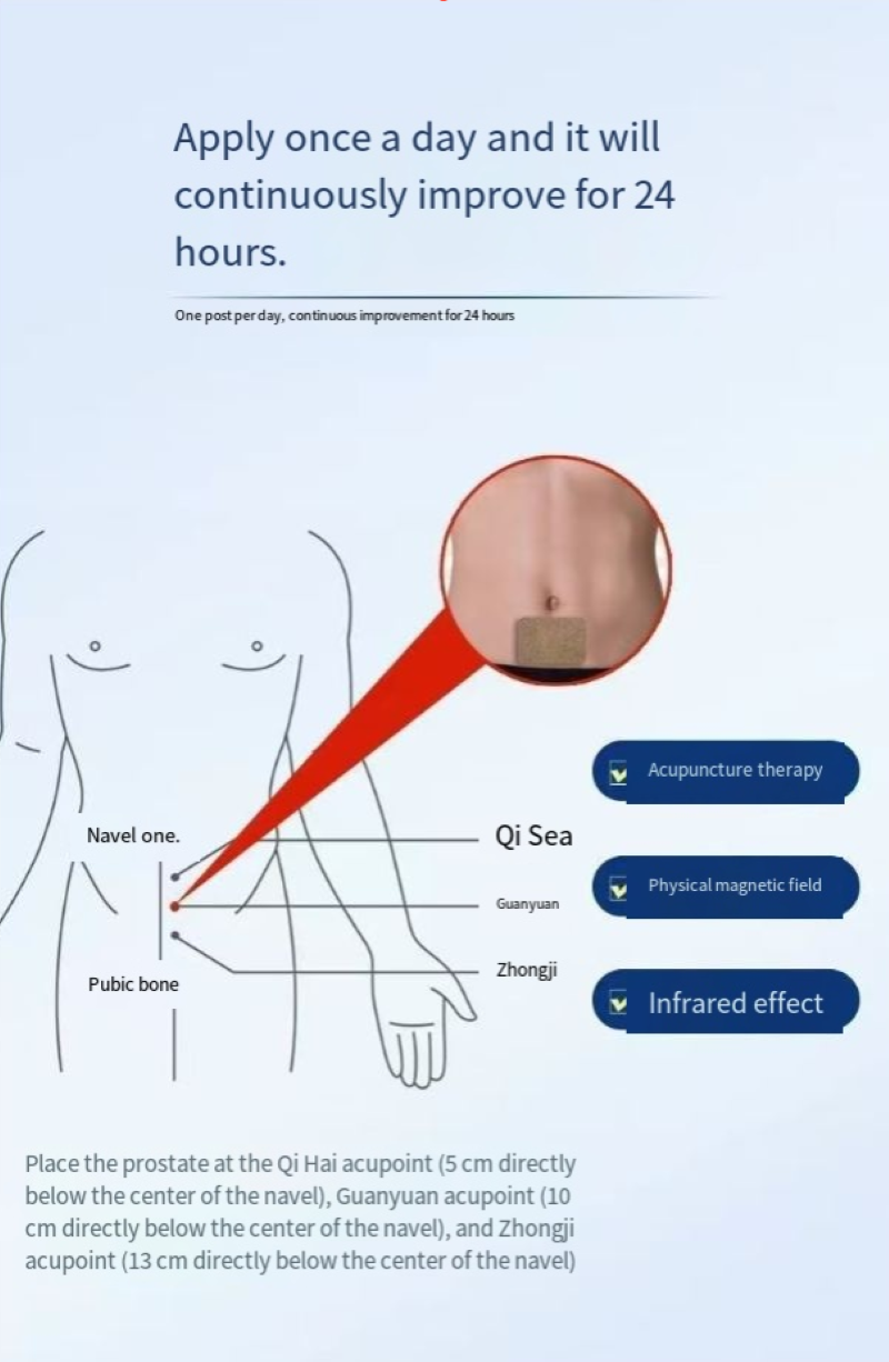 Utiliza o princípio da estimulação da pressão de ponto de acucidade e é feito com ingredientes herbais selecionados. O adesivo é aplicado em pontos de acupuntura relacionados à próstata, como Guanyuan, por meio de estimulação física e penetração herbal, atingindo precisamente a área da próstata. Ela pode aliviar sintomas como micção frequente, micção urgente e fluxo urinal ruim causado por aumento e inflamação da próstata, melhorar o problema da noctúria frequente e ajudar você a se despedir do constrangimento dos despertares noturnos frequentes e recuperar um sono tranquilo durante a noite.