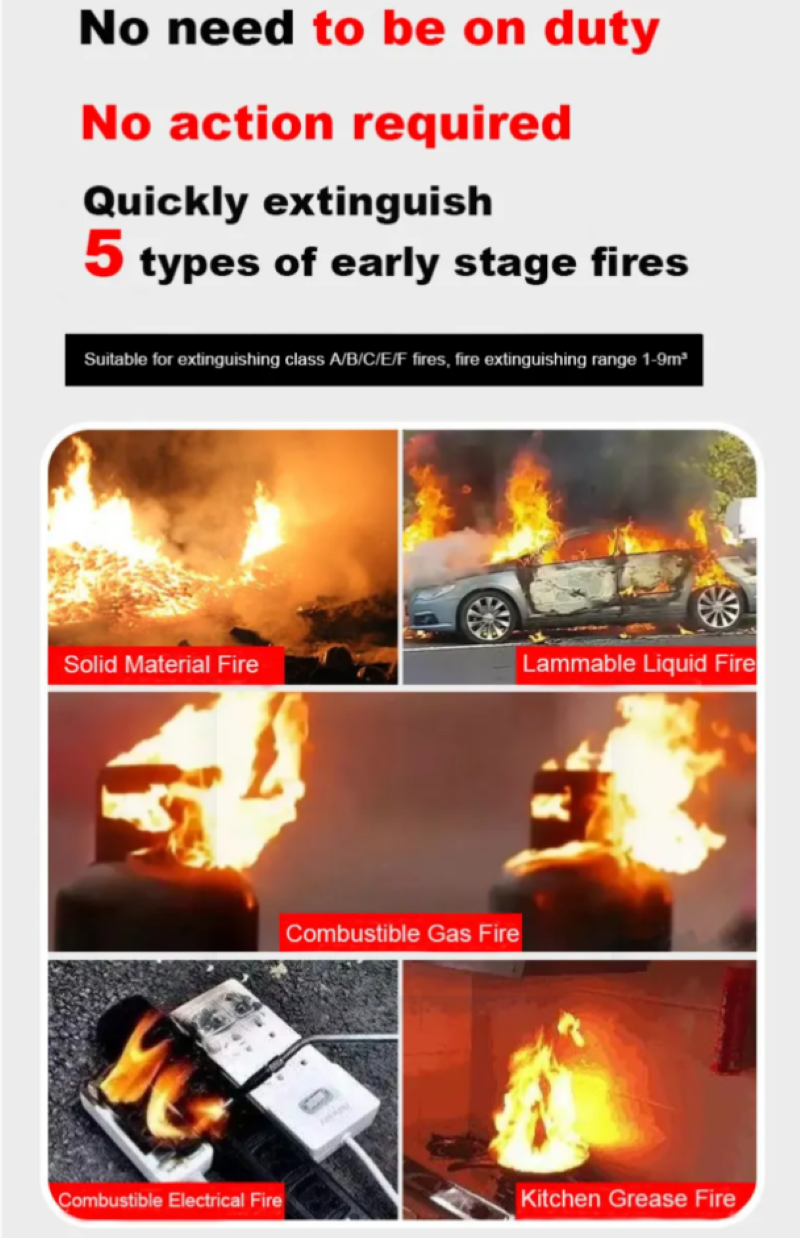 Não requer operação manual e não precisa aprender etapas complexas como os extintores de incêndio tradicionais. Mesmo os idosos e crianças em casa podem ser "protegidos automaticamente" ao se depararem com uma situação de incêndio, alcançando verdadeiramente "resposta ao fogo em segundos sem intervenção humana".