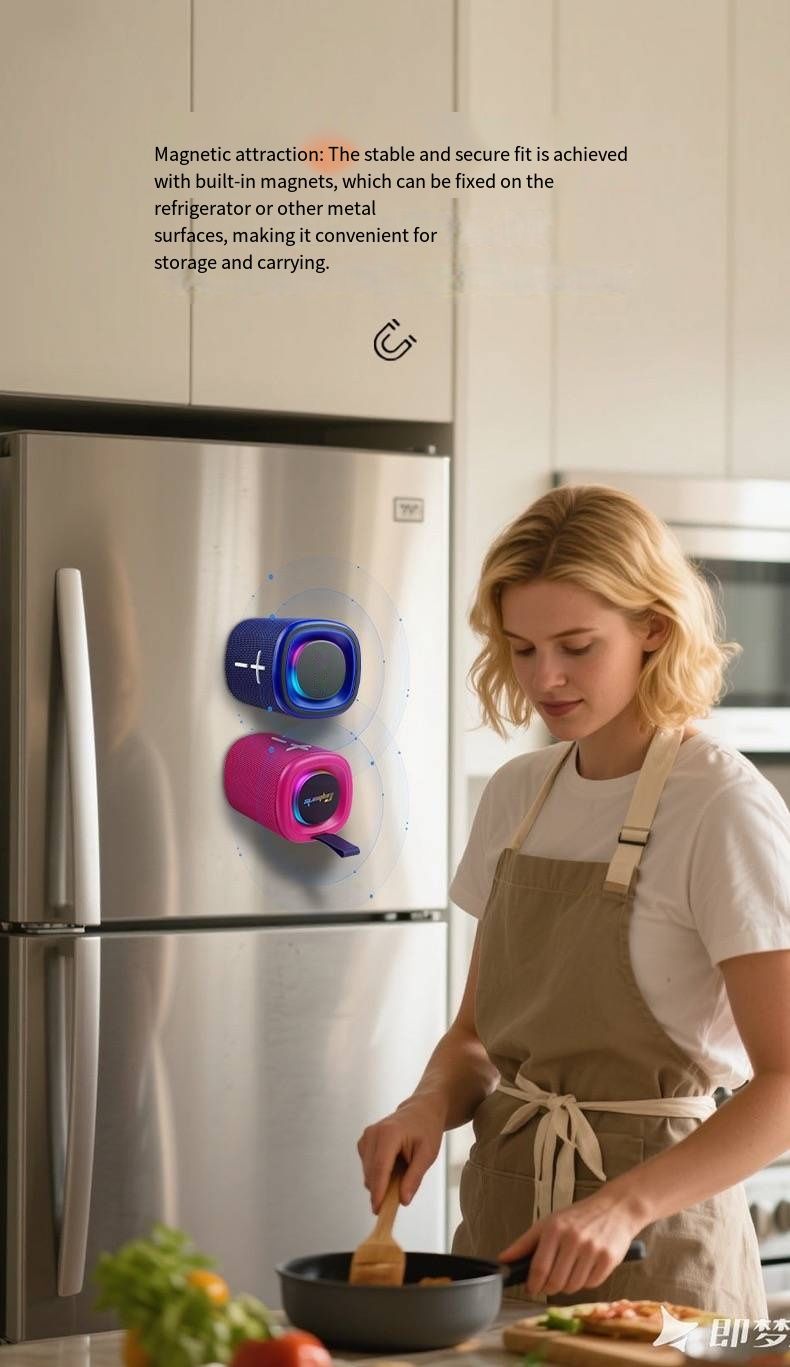 O alto-falante Bluetooth é seu companheiro para toda a vida musical. Possui impermeabilização nível IPX6, estrutura de cavidade impermeabil selada e não tem medo da chuva, tornando-o seguro para uso interno e externo. Ele suporta vários modos de reprodução, como sem fio, cartão TF e cabeado AUX, e é compatível com múltiplos formatos de arquivos de áudio. Também conta com luzes coloridas e dinâmicas, com as luzes de respiração dançando junto com o ritmo da música, criando uma atmosfera imersiva onde música e luz se misturam. Além disso, possui uma função de fixação magnética, permitindo que se adera com segurança a superfícies metálicas, como geladeiras, possibilitando que você assista à música a qualquer momento durante o cozinhar na cozinha. Seja acampando ao ar livre, relaxando em casa ou ocupado na cozinha, ele pode proporcionar uma experiência de alta qualidade entre audição e visão.