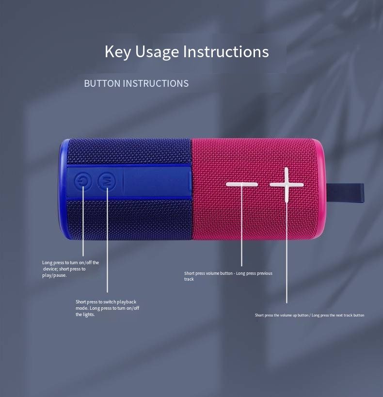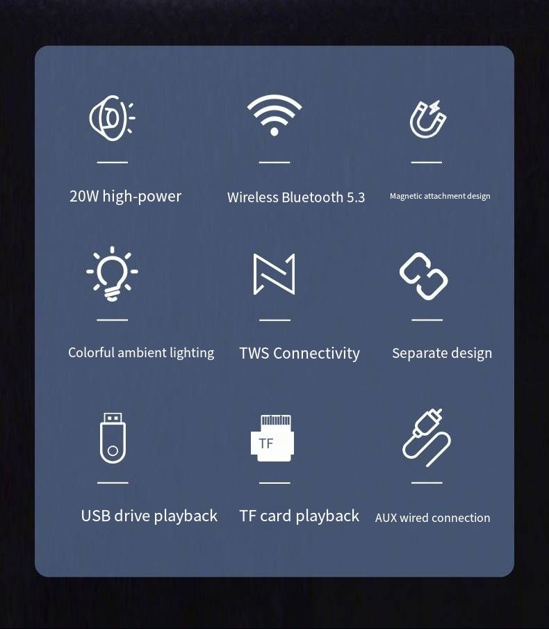 Também é realçado por luzes rítmicas coloridas, que mudam de cor conforme o ritmo da música. Durante o acampamento, é o impulsionador de atmosfera; Durante festas, é o foco visual. Que a música não seja apenas "ouvida", mas também "vista". A duração da bateria é longa, e uma única carga pode durar várias horas de diversão musical. Você não vai se preocupar com quedas de energia durante um dia inteiro ao ar livre.