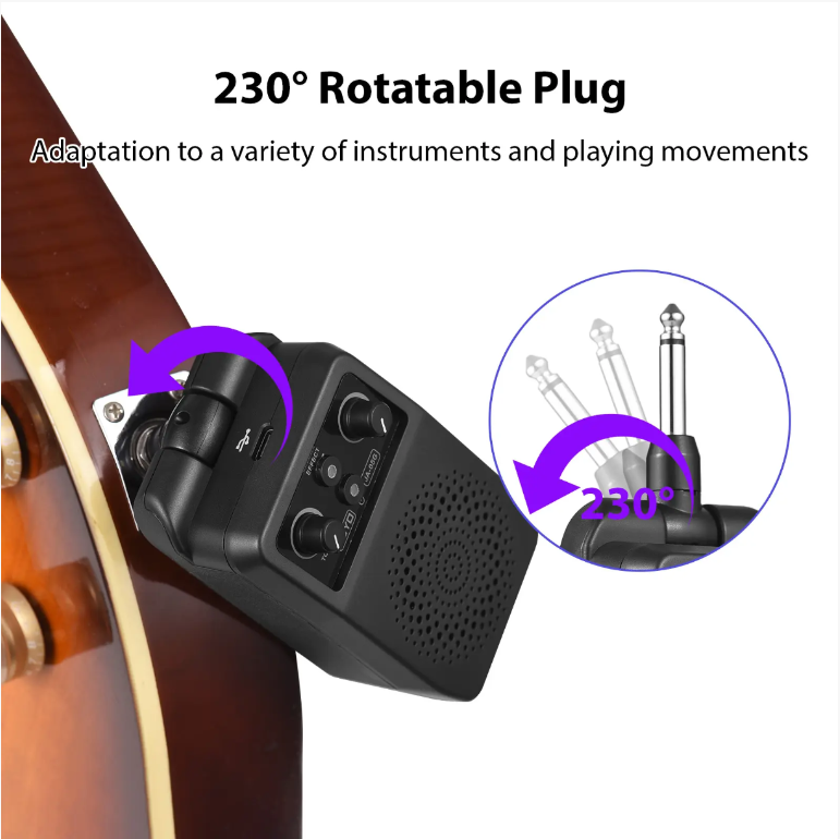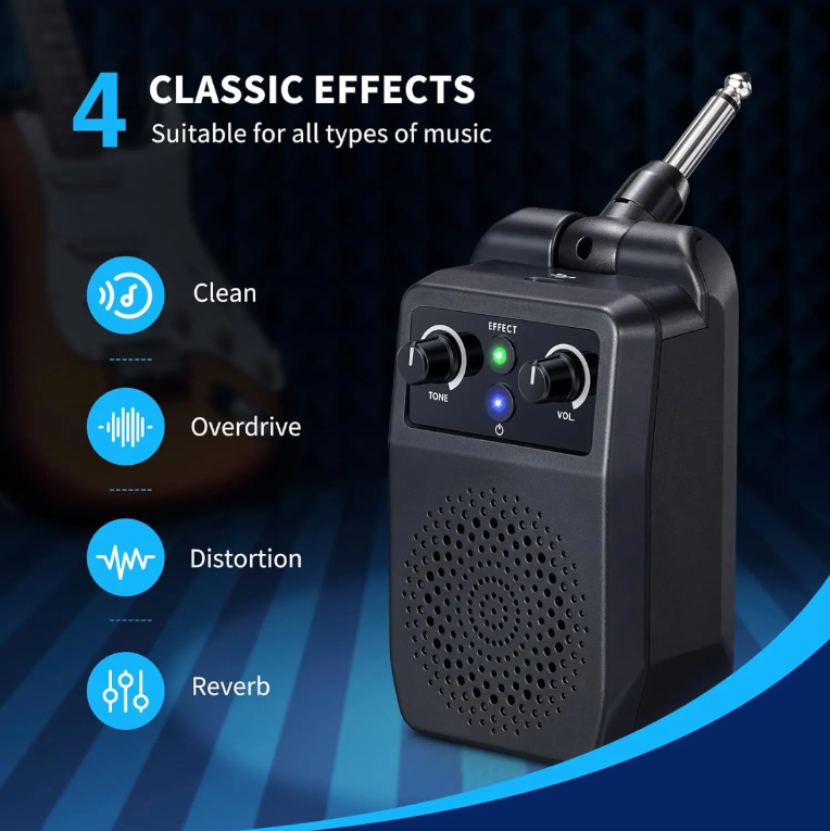Playing the guitar in public might disturb others, and playing outdoors without the necessary equipment? This portable electric guitar speaker is the "pocket companion" for musicians. It comes with 4 classic sound effects + Bluetooth connection. With its small size, it has great power, allowing musicians to practice and play more freely.