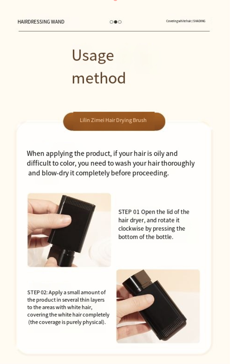 Não é preciso misturar o creme de tinta ou embrulhá-lo em filme plástico – basta desrosquear o creme, pentear algumas vezes ao longo do cabelo branco como você faria com o cabelo, e o creme cobre uniformemente os fios. O cabelo branco visível fica coberto instantaneamente, e todo o processo leva apenas 1 minuto. Depois de pentear, não precisa lavar, o creme adere ao cabelo e não fica pegajoso, não arranha a gola ou a testa, e você pode tirar e pentear duas vezes antes de sair para uma consulta ou encontrar clientes, deixando seu cabelo "uniforme e jovem".