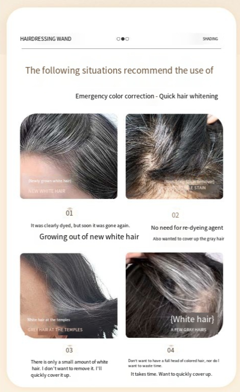 O cabelo branco recém-crescido faz você parecer mais velha? Tingir a cabeça inteira leva muito tempo e danifica o cabelo? Você acha os pelos brancos nas têmporas muito evidentes quando sai? Este Kit de Tingimento e Penteamento Li Lin Zhi Shu combina o creme de tingimento e o pente, permitindo que você cubra o cabelo branco com apenas um pente. É perfeito para situações de emergência, tingimento diário e fácil de usar.