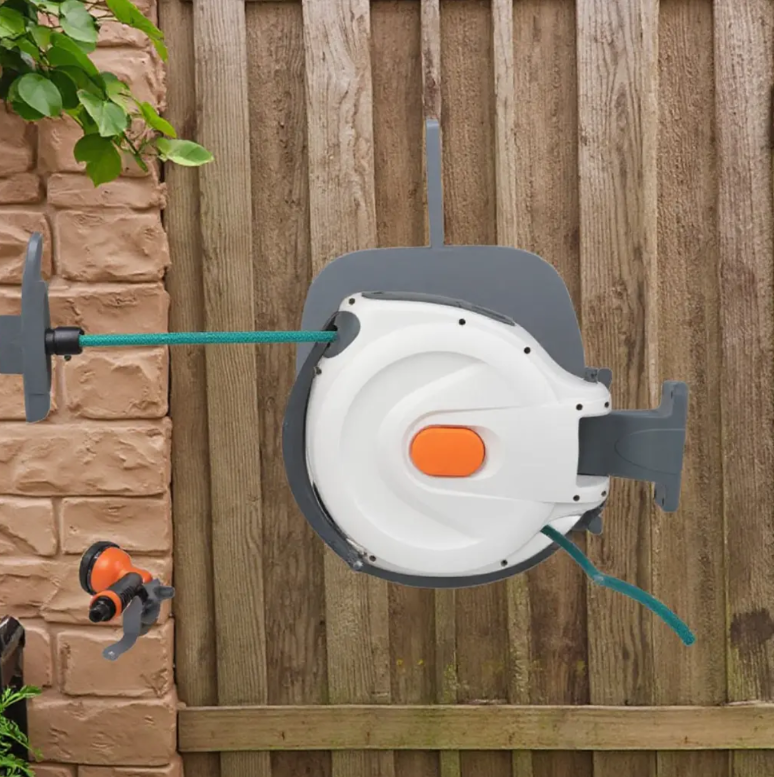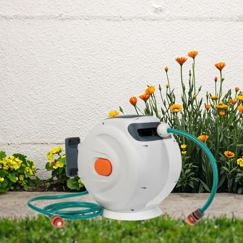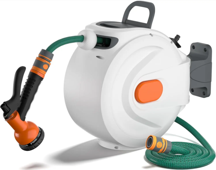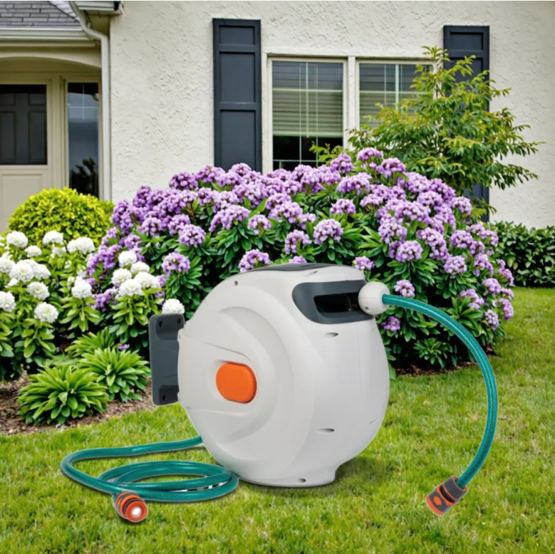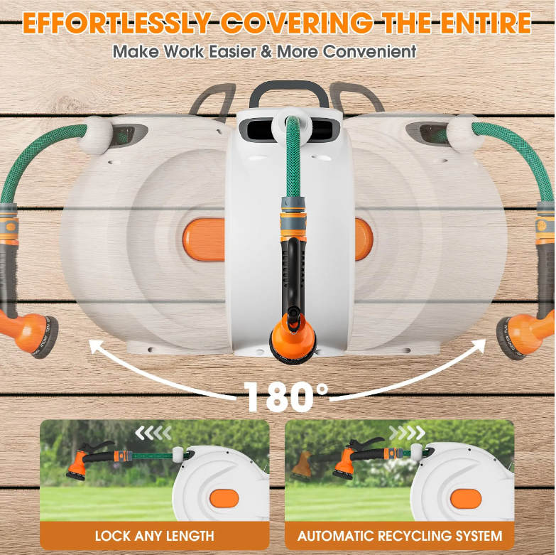 É um "gerenciador inteligente" para armazenamento de tubulações de água, equipado com um sistema de recuperação automática. Um tubo de água de PVC de 50 pés (aproximadamente 15 metros) pode ser esticado livremente de acordo com a necessidade, e a quantidade esticada pode ser usada completamente. Quando não estiver em uso, pode ser retraído automaticamente com um toque suave. Isso elimina completamente o problema tradicional de canos de água serem "irrecuperáveis e inadequados para armazenamento".