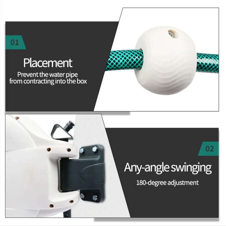 Também é equipado com um design montado na parede giratório de 180°. Pode ser facilmente instalado em cercas de madeira, paredes de tijolos ou paredes de garagem. Quando em uso, o tambor de água pode girar livremente, permitindo que a água flua por todos os cantos do jardim e por todas as fendas da garagem. De "desordem semelhante a uma corda bagunçada" a "armazenamento invisível com um clique", isso pode ser alcançado com apenas um tambor de água.