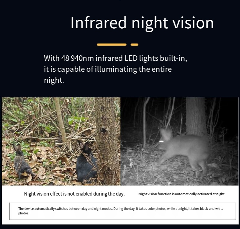 Nas profundezas da selva escura, uma câmera comum só pode capturar uma cena caótica. No entanto, esta câmera está equipada com duas luzes infravermelhas de alta potência de 850 nm, permitindo que o alcance da visão noturna atinja até 20 metros. Com sua tecnologia de imagem infravermelha silenciosa, ele permite a exibição clara das atividades dos animais noturnos: seja o passeio de veados sob o luar ou o movimento de raposas na grama, todos eles podem ser registrados em delicadas imagens em preto e branco, como se abrissem a "visão noturna escura" para você, permitindo que você entenda os hábitos noturnos desconhecidos dos animais selvagens.