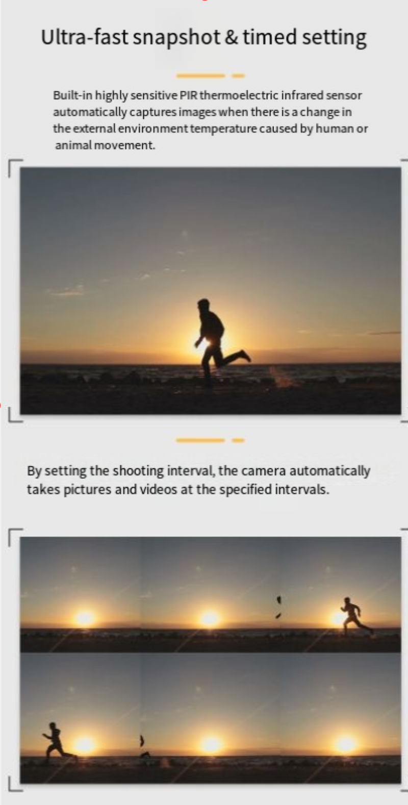 Three motion detection sensors form an intelligent sensing network. Once an animal enters the detection range, it will quickly trigger the shooting, capturing the wonderful moments with "zero delay" response, never missing any natural mystery. At the same time, it has a waterproof camouflage appearance, which can perfectly blend into various outdoor environments such as jungles and mountains, with extremely strong concealment, allowing animals to display their most natural behavior without being noticed.