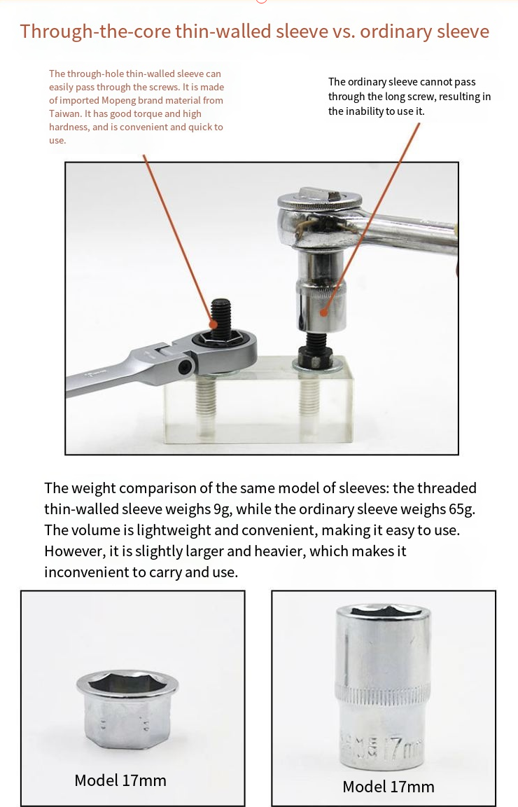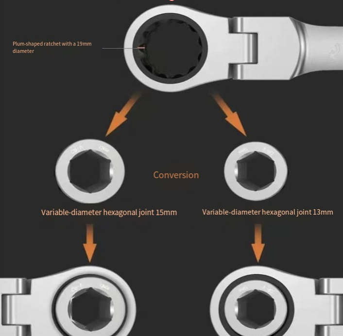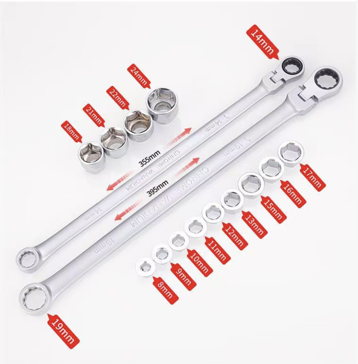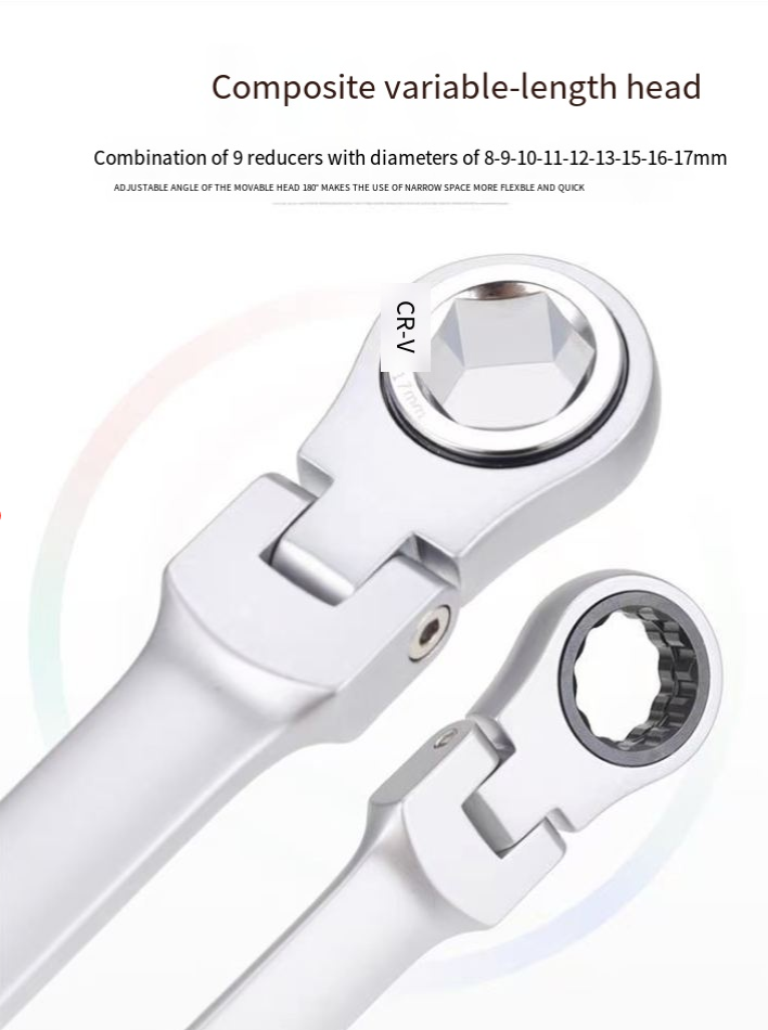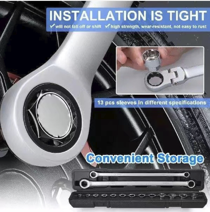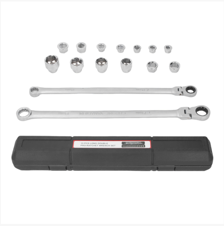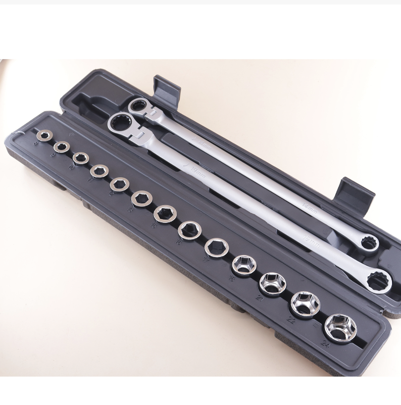A configuração de tamanho completo de 15 peças cobre várias necessidades: desde parafusos minúsculos até parafusos grandes, correspondentes a 13 soquetes de tamanhos diferentes. Seja desmontando pneus e componentes do chassi durante reparos automotivos ou montando móveis e consertando canos durante reformas residenciais, ele pode "lidar com tudo de uma vez só". O design ativo de longo alcance permite que a cabeça da chave ajuste o ângulo de forma flexível, adaptando-se a várias posições complicadas de instalação, eliminando completamente o desconforto de "a chave não ser potente o suficiente".