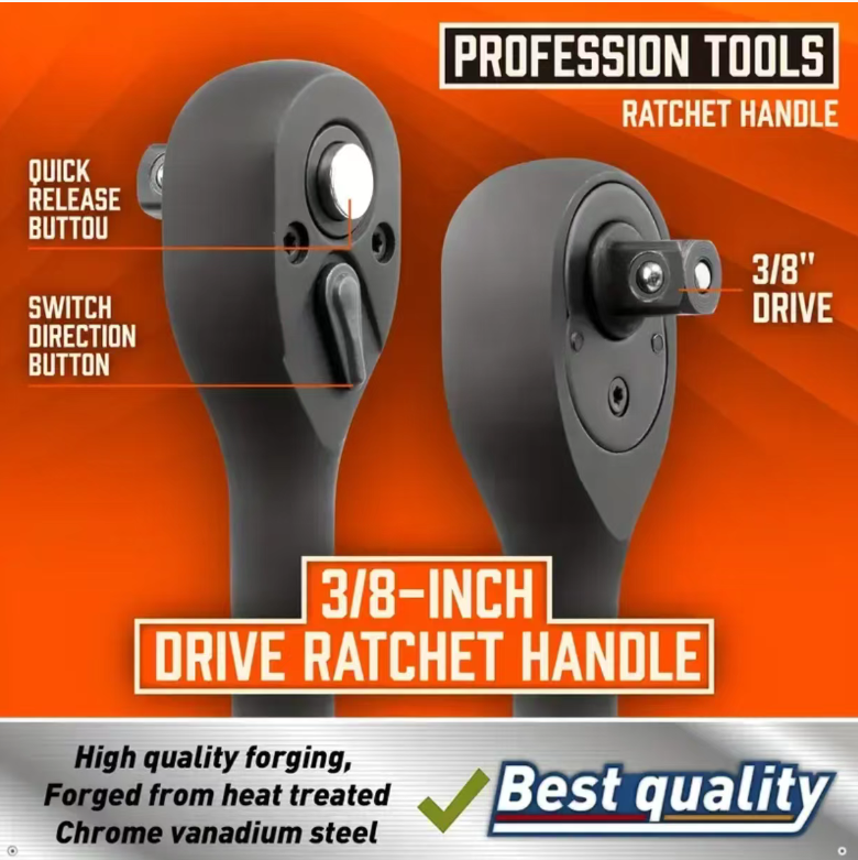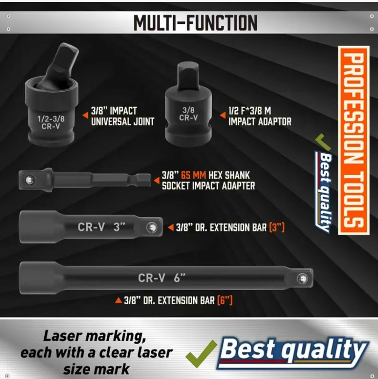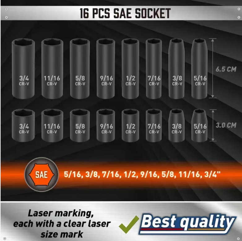 Os soquetes e acessórios são feitos de aço de alta qualidade com cromo-vanádio, com um tratamento especial de superfície para prevenir ferrugem, resistência ao desgaste e forte resistência a impactos. Mesmo em operações de impacto de alta intensidade, eles têm menos probabilidade de deformar ou rachar. A escala gravada a laser é transparente e resistente ao desgaste, podendo ser rapidamente identificada pelo tamanho ao longo de um longo período de uso, evitando o constrangimento de escolher a ferramenta errada.