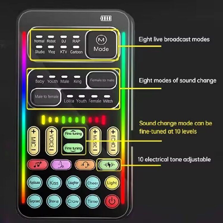 Seu funcionamento é tão simples quanto pressionar um controle remoto: após ligar, conecte os fones de ouvido e clique em "Voice Changer" para trocar de voz: um menino pode se transformar instantaneamente em uma menina doce, uma menina pode mudar sua voz para uma mulher profunda e elegante, e até música eletrônica demoníaca e vozes fofas de bebês podem ser controladas com precisão. Combinado com a tecla "Efeito sonoro", ele pode adicionar reverberação e afinação à voz, e instantaneamente se tornar um "especialista em voz" durante a transmissão ao vivo, virando uma "especialista em voz feminina" para encantar seu parceiro durante uma sessão de jogo, e seus companheiros não conseguem evitar jogar melhor em duas rodadas.