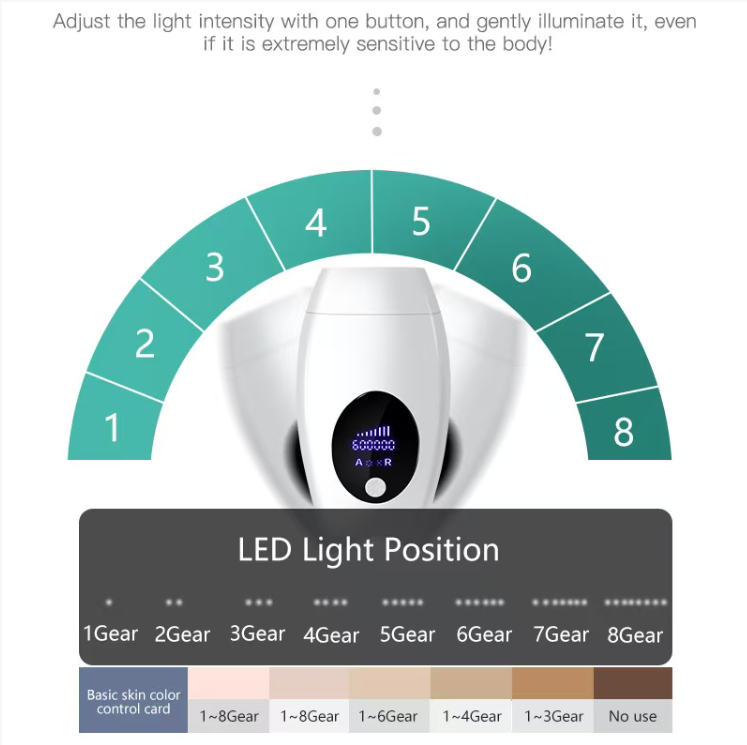 Sua principal vantagem é a **experiência dupla "precisa e eficiente + indolor e segura": ele adota a tecnologia IPL de luz pulsada forte de alto nível, que pode penetrar profundamente na raiz do folículo piloso e inibir suavemente o crescimento capilar. Combinado com 8 níveis de ajuste de energia, pode encontrar o nível adequado para peles sensíveis e peles tolerantes. Ele pode ser alternado livremente entre 2 modos – o modo de pisca manual cuida precisamente dos detalhes como a área dos lábios e axilas, e o modo de piscar contínuo com pressão longa pode cobrir eficientemente grandes áreas dos membros. A eficiência da depilação é dobrada.