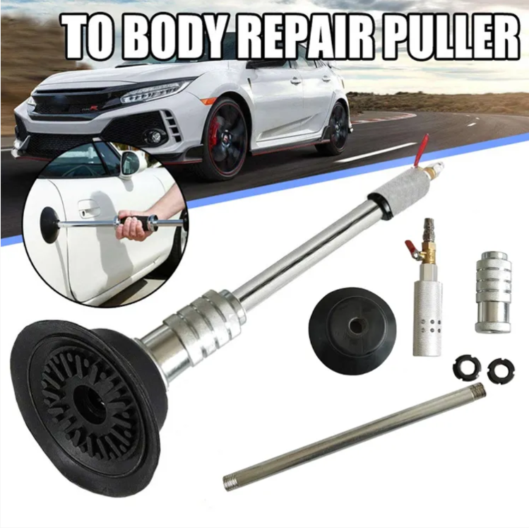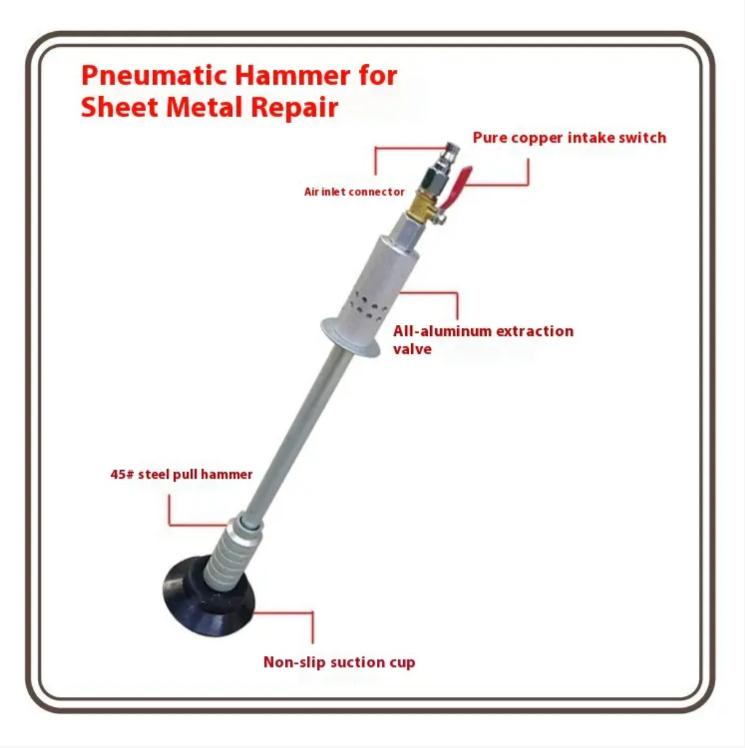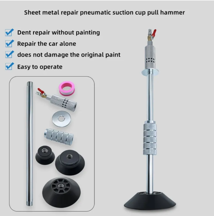 Contando com o sistema de energia pneumática, o ar comprimido é convertido em forte força de tração e a potência excede em muito a dos martelos de tração manuais. A principal vantagem do "modelo de grande porte" reside em uma área de contato com ventosa maior + um curso de martelo de tração mais longo. Ele pode superar facilmente grandes depressões (como amassados de colisão de portas de carros) e depressões profundas (como poços de arranhões de pára-choques). Com apenas um puxão, a chapa metálica pode ser rebatida e reposta, sem a necessidade de operações repetidas, melhorando significativamente a eficiência do reparo. Mesmo mecânicos de automóveis experientes elogiarão sua "eficiência".