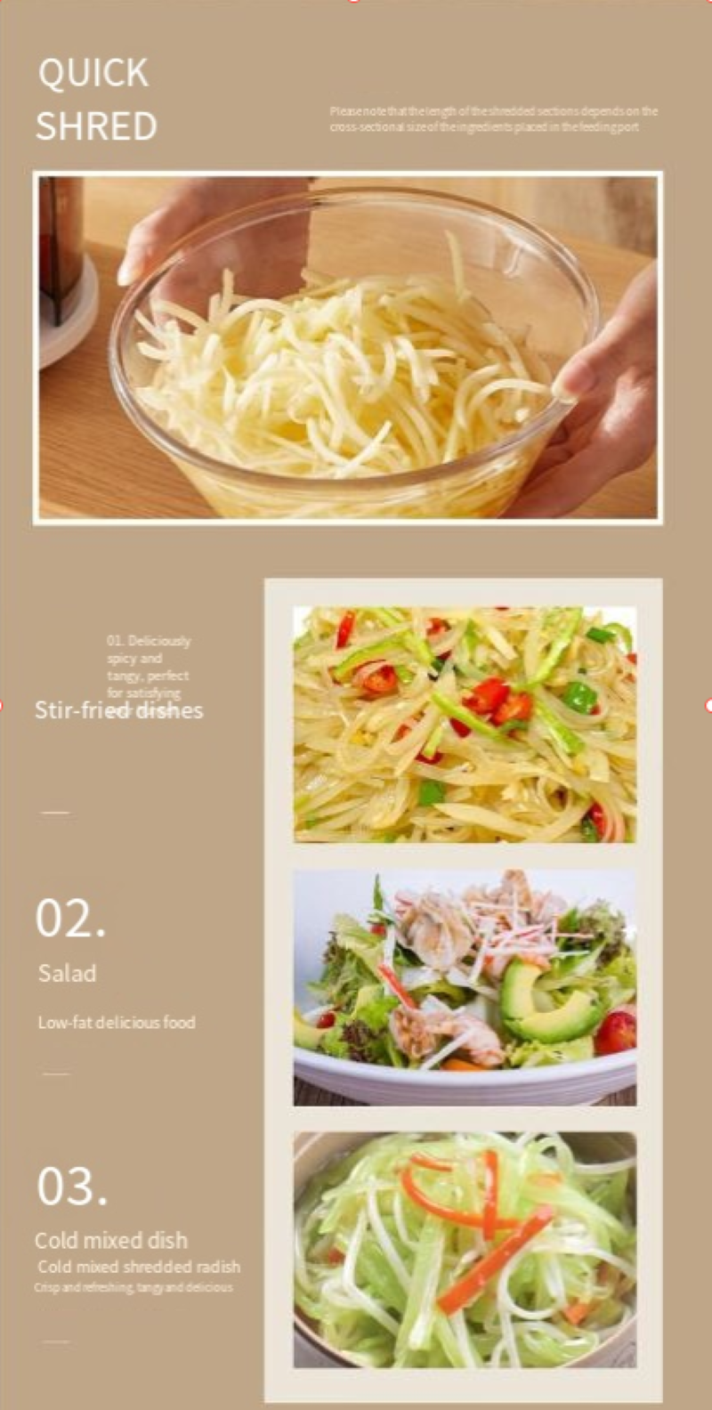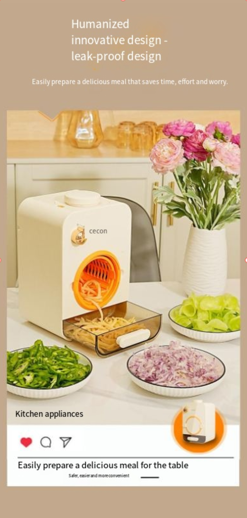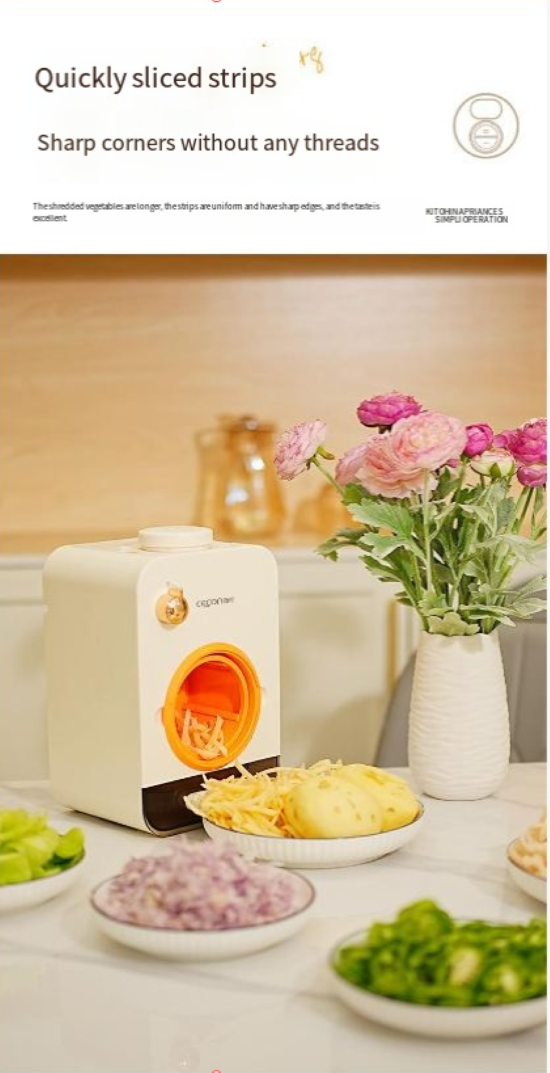 Você ainda está preocupado com o complicado processo de cortar legumes e preparar refeições? Este cortador de legumes elétrico de alto apelo é realmente uma "maravilha de fatiar e cortar" na cozinha. Com seu design inovador e desempenho eficiente, ele redefine sua experiência culinária, transformando a preparação de refeições de uma tarefa demorada em uma atividade agradável e sem esforço.