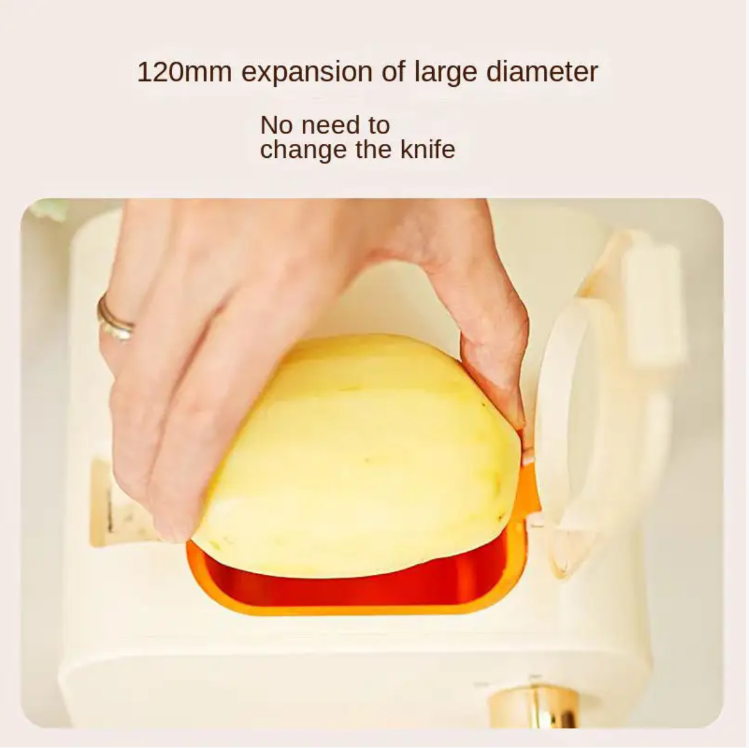 Quebrando a limitação tradicional de "os ingredientes precisam ser picados" em dispositivos de corte, a porta de alimentação ultragrande de 120 mm pode acomodar batatas e cenouras inteiras, eliminando a necessidade de corte segmentado. É conveniente e eficiente. Ingredientes grandes podem ser alimentados uma vez e cortados em um prato cheio de pratos, dobrando a eficiência da preparação do prato.