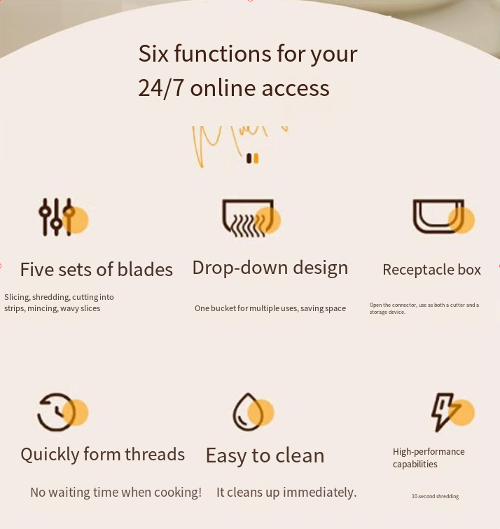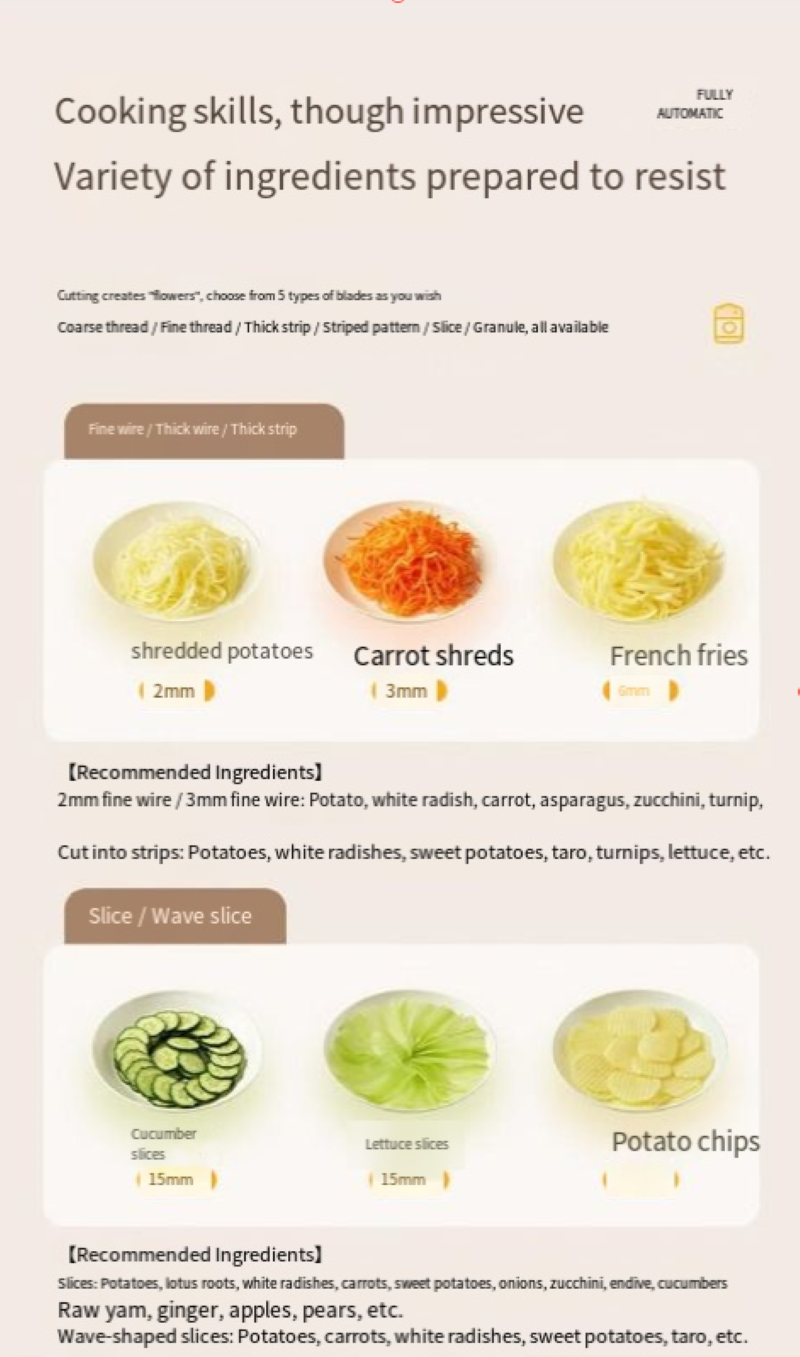 Seu efeito de fatiar e cortar em cubos é de nível profissional. Quer se trate de rabanete crocante, batatas fofas ou pepinos macios, basta colocá-los na máquina e empurrar suavemente, e imediatamente obter fatias ou pedaços uniformes e delicados. Os ingredientes cortados são "claramente definidos sem quebrar", tornando-os adequados para fazer pratos frios, refogados ou sopas. Com 5 lâminas funcionais diferentes que podem ser trocadas à vontade, para fatiar, cortar ou cortar flores... Este pode atender a várias necessidades e, assim, dizer adeus ao ocupado "esgrima e faca" na tábua de cortar, dando a você mais tempo para se concentrar na culinária criativa.