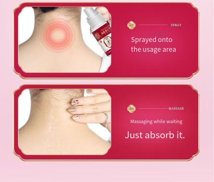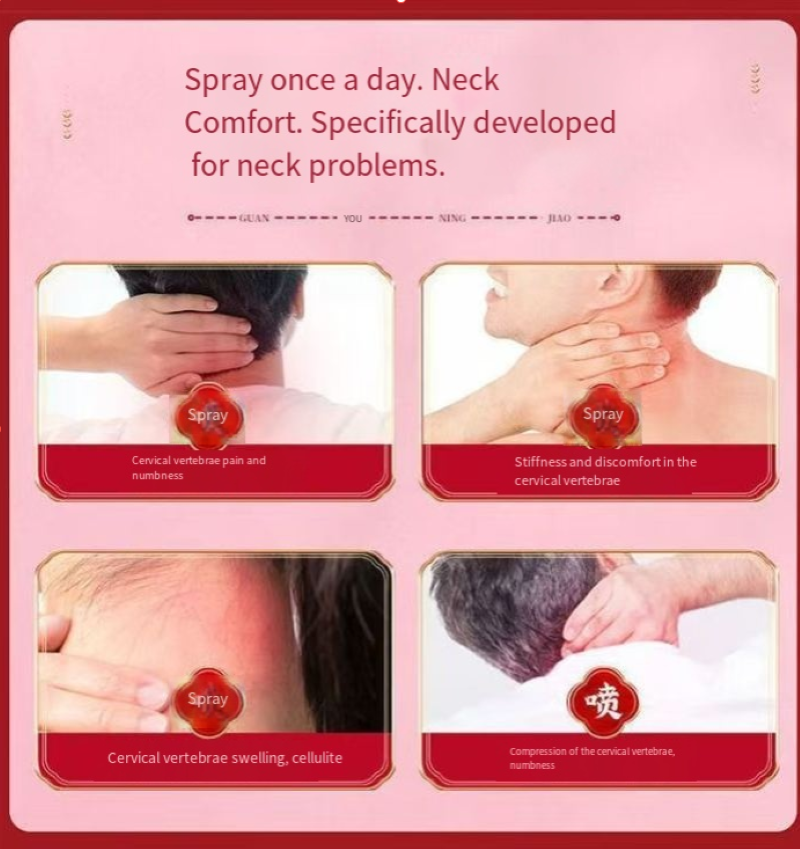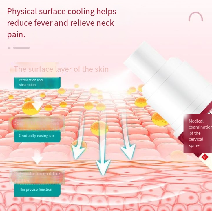 Ele usa tecnologia de compressa fria física. Após a pulverização, pode remover rapidamente o calor local no pescoço, aliviar a congestão e o inchaço do pescoço causados por ficar sentado por muito tempo sentado e uso excessivo; Ao mesmo tempo, incorpora essências de ervas, que penetram suavemente nos tecidos do pescoço e ombros, aliviando a dor e a rigidez desde a superfície até as camadas profundas.