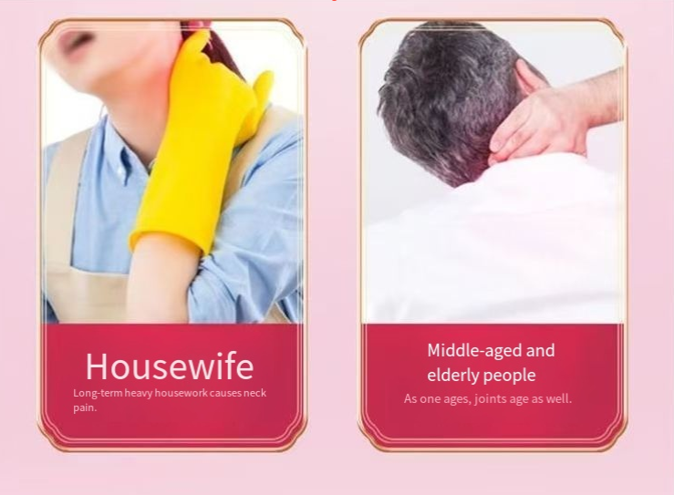 Quer se trate de trabalhadores de escritório que ficam sentados por longos períodos, aqueles com músculos tensos e restritos do pescoço e atividades causadas por distúrbios prolongados, pessoas de meia-idade e idosos com dores recorrentes causadas por doenças degenerativas cervicais ou viciados em telefones celulares que sofrem de tensão cervical causada por distúrbios prolongados ao usar seus telefones, basta borrifá-lo na região cervical e massagear suavemente até que seja absorvido. Você pode sentir a sensação de frio se espalhando e a dor será aliviada.