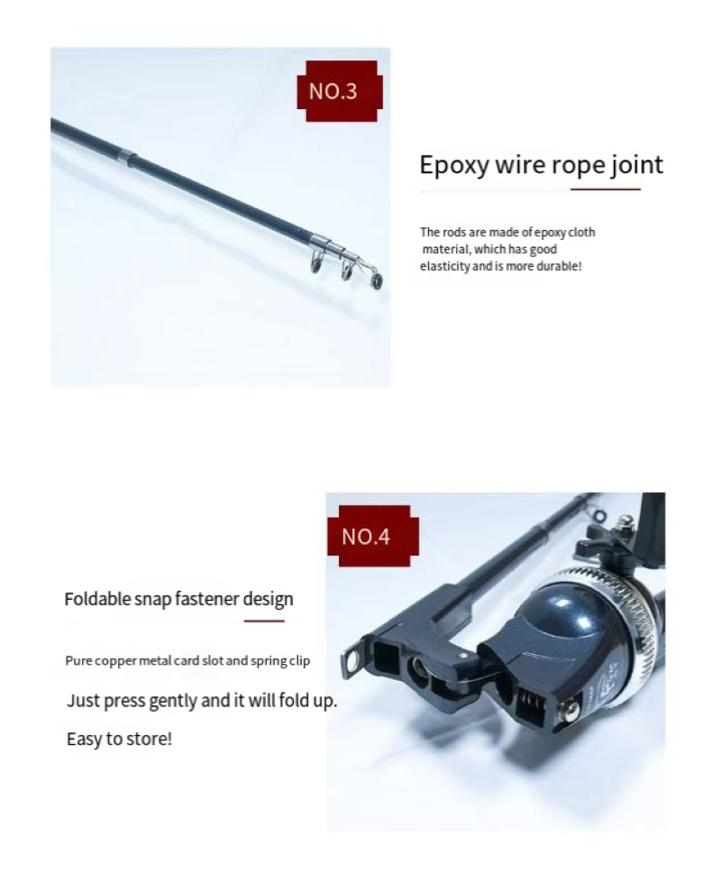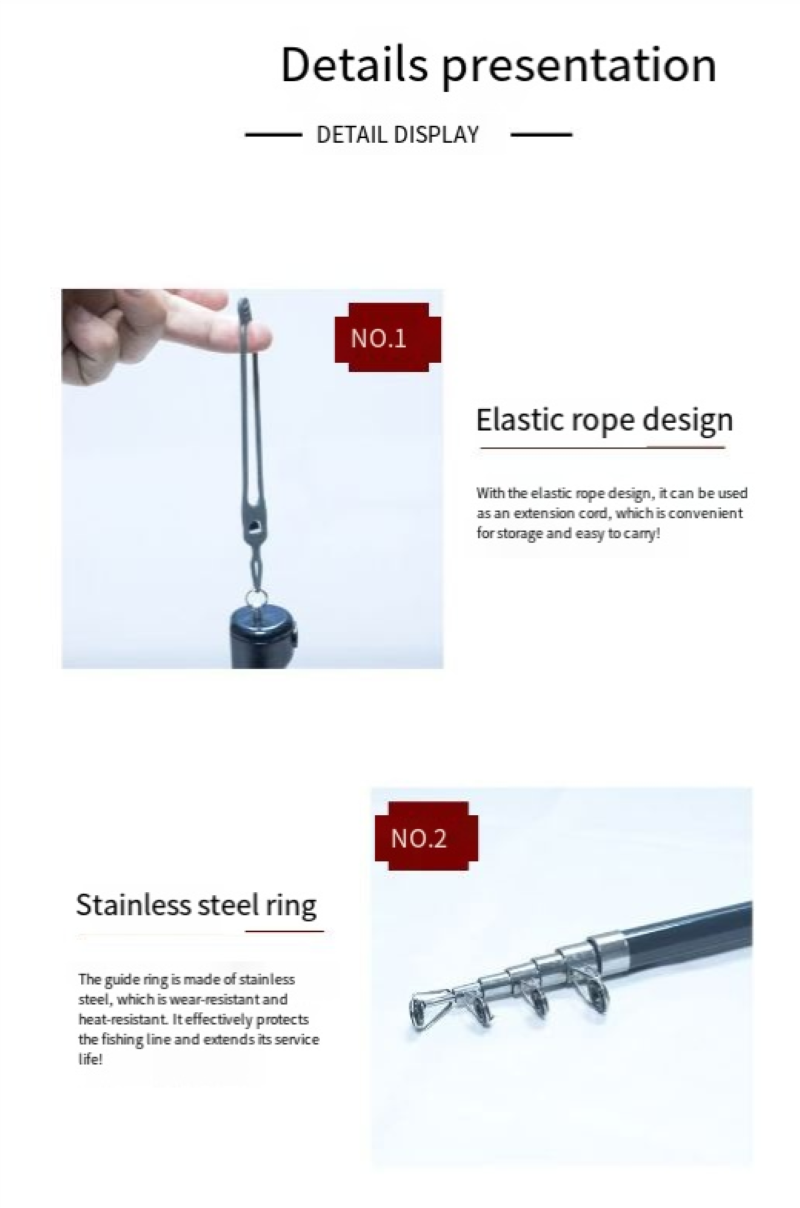 Embora seja pequeno, o eixo é feito de fibra de carbono altamente elástica, que é resistente e capaz de suportar cargas pesadas. Ele pode lidar com 3-5 kg de carpas crucianas e carpas com facilidade. O cabo é sensível e, mesmo quando peixes de boca leve mordem o anzol, o sinal pode ser transmitido claramente. Ele combina portabilidade com praticidade, sendo suficiente para pesca casual na natureza.