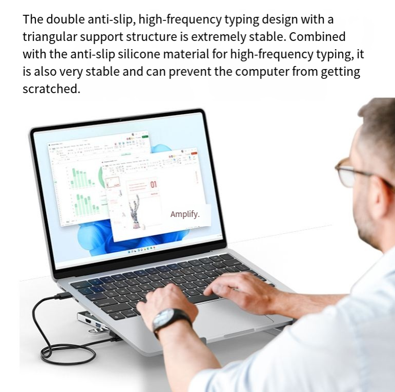 É o motor de eficiência para cenários de escritório. Com um design de suporte ergonômico, eleva o laptop a uma altura confortável que se adapta à postura visual e sentada humana, aliviando efetivamente a pressão nas vértebras cervicais e lombares, permitindo que você mantenha um bom estado durante longos períodos de trabalho. Ao mesmo tempo, o dock de expansão multi-interface integrado resolve facilmente o problema de interfaces de laptop insuficientes, permitindo a conexão perfeita de dispositivos externos, como monitores, teclados, mouses e unidades USB, criando um espaço de trabalho de desktop eficiente. Seja escrevendo propostas, processando dados ou videoconferências, você pode lidar com eles com facilidade.