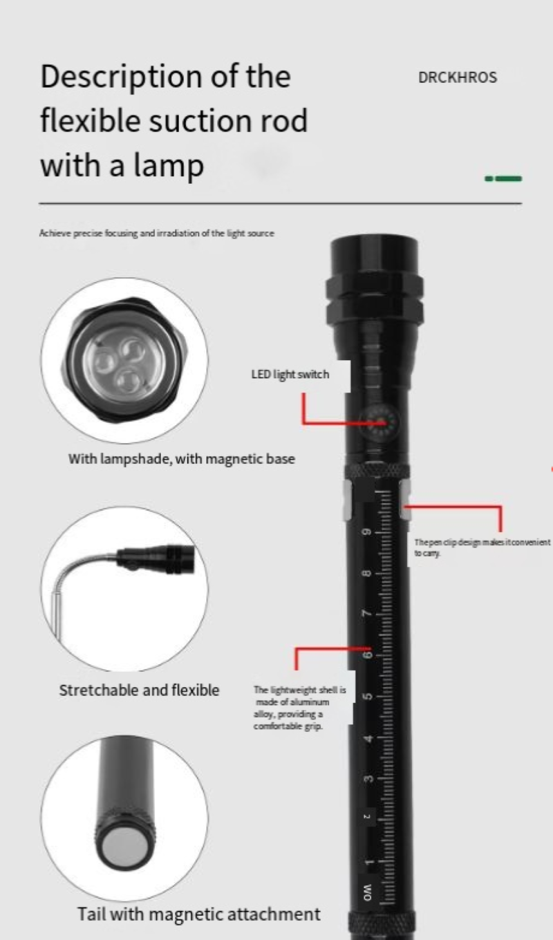 Também está equipado com 3 lâmpadas LED de alta intensidade, proporcionando brilho suficiente e longo alcance. Mesmo em cantos escuros, ele pode iluminar de forma clara e transparente, permitindo que os detalhes finos das pequenas peças sejam claramente vistos. A haste retrátil é feita de material metálico resistente à ferrugem, a mangueira é flexível e suporta flexões, a lanterna tem longa duração da bateria e é durável e confiável para diversas situações, como reparos diários do carro, reforma residencial e limpeza residencial.