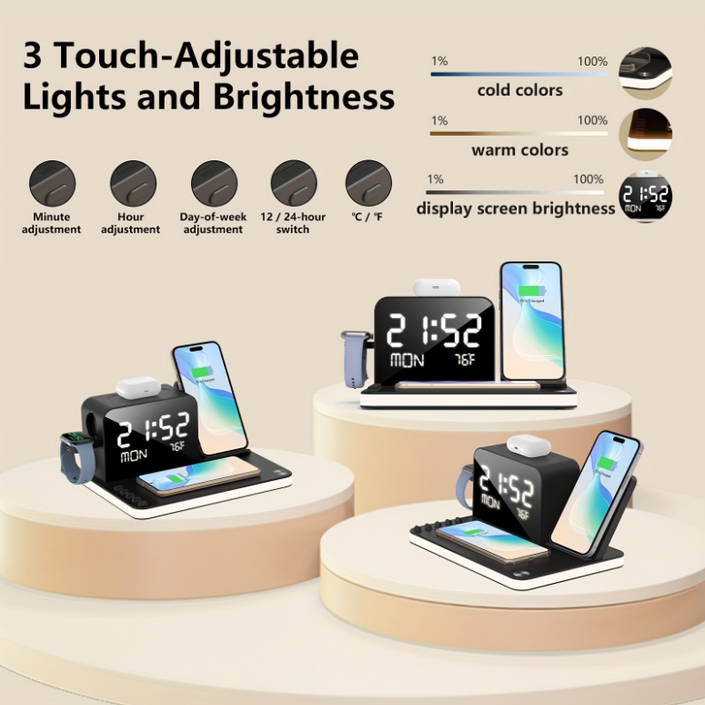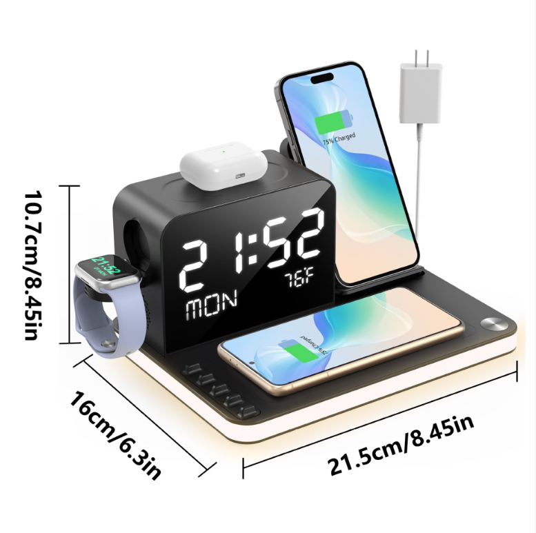 Você ainda está incomodado com os cabos de carregamento bagunçados em sua área de trabalho e a baixa velocidade de carregamento de seus dispositivos? Esta estação de carregamento multifuncional 7 em 1 combina carregamento sem fio, exibição do relógio e armazenamento de mesa, tudo em um. Com sua potência de carregamento rápido de 30W, ele reorganiza sua área de trabalho digital de maneira ordenada.