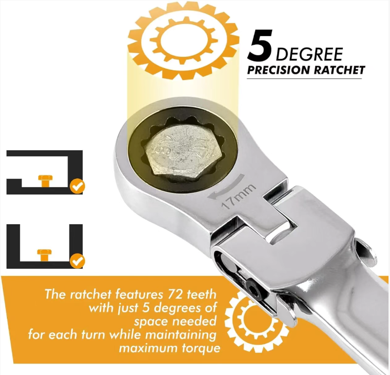 Com um design de catraca de 72 dentes, cada rotação requer apenas um ângulo de 5° para engatar e gerar força: em áreas estreitas, como chassis de carros e espaços entre tubos, não há necessidade de ajustar constantemente a direção da chave. Com apenas uma mão, você pode girá-lo rapidamente, evitando a situação desconfortável de "não conseguir girar por falta de espaço" e melhorando significativamente a eficiência do trabalho. Os interruptores para frente e para trás podem ser facilmente trocados com um clique, e é conveniente para apertar e afrouxar parafusos.
