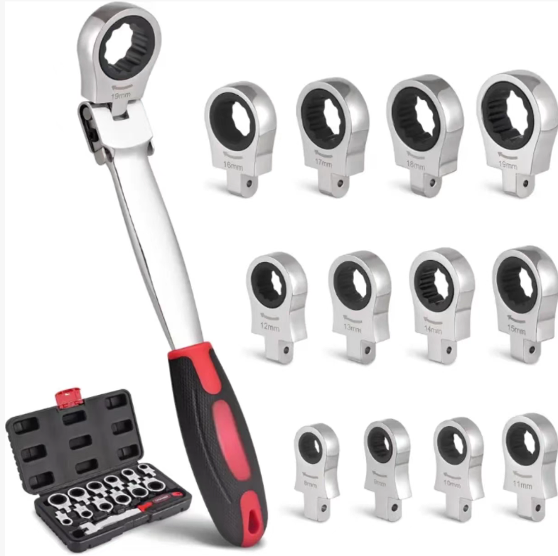 O kit inclui cabeças de tamanho completo de 8 a 19mm, cobrindo 90% das especificações dos parafusos no uso diário: seja parafusos grossos no compartimento do motor de um carro ou parafusos finos em ferragens de móveis, basta trocar a cabeça com um clique e não precisa procurar por várias chaves manuais. As cabeças são forjadas em aço cromovanádio CRV, com dureza HRC52, tornando-as menos propensas a deslizar ou deformar ao apertar parafusos duros, e altamente duráveis.